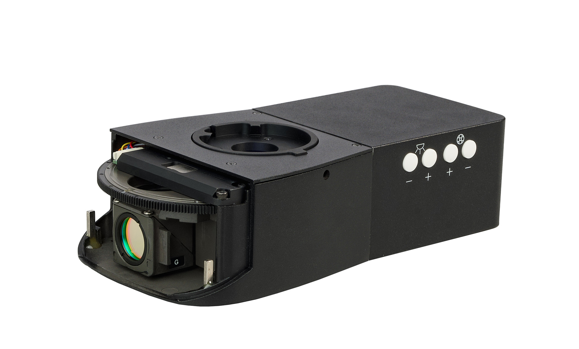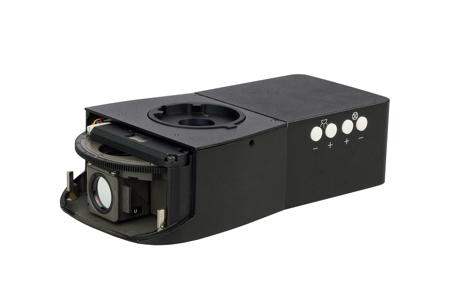 Насадка интегрируется в оптический путь микроскопа, располагаясь между револьверным устройством и штативом. Ее конструкция включает моторизованную турель, предназначенную для одновременной установки нескольких фильтров, а также для работы в светлом поле в проходящем свете. Смена фильтра осуществляется нажатием на кнопки: одна кнопка отвечает за поворот турели по часовой стрелке, другая – против часовой стрелки. Благодаря этому пользователь может быстро переключаться между режимами работы, что упрощает процесс исследования образцов и повышает эффективность проведения экспериментов.