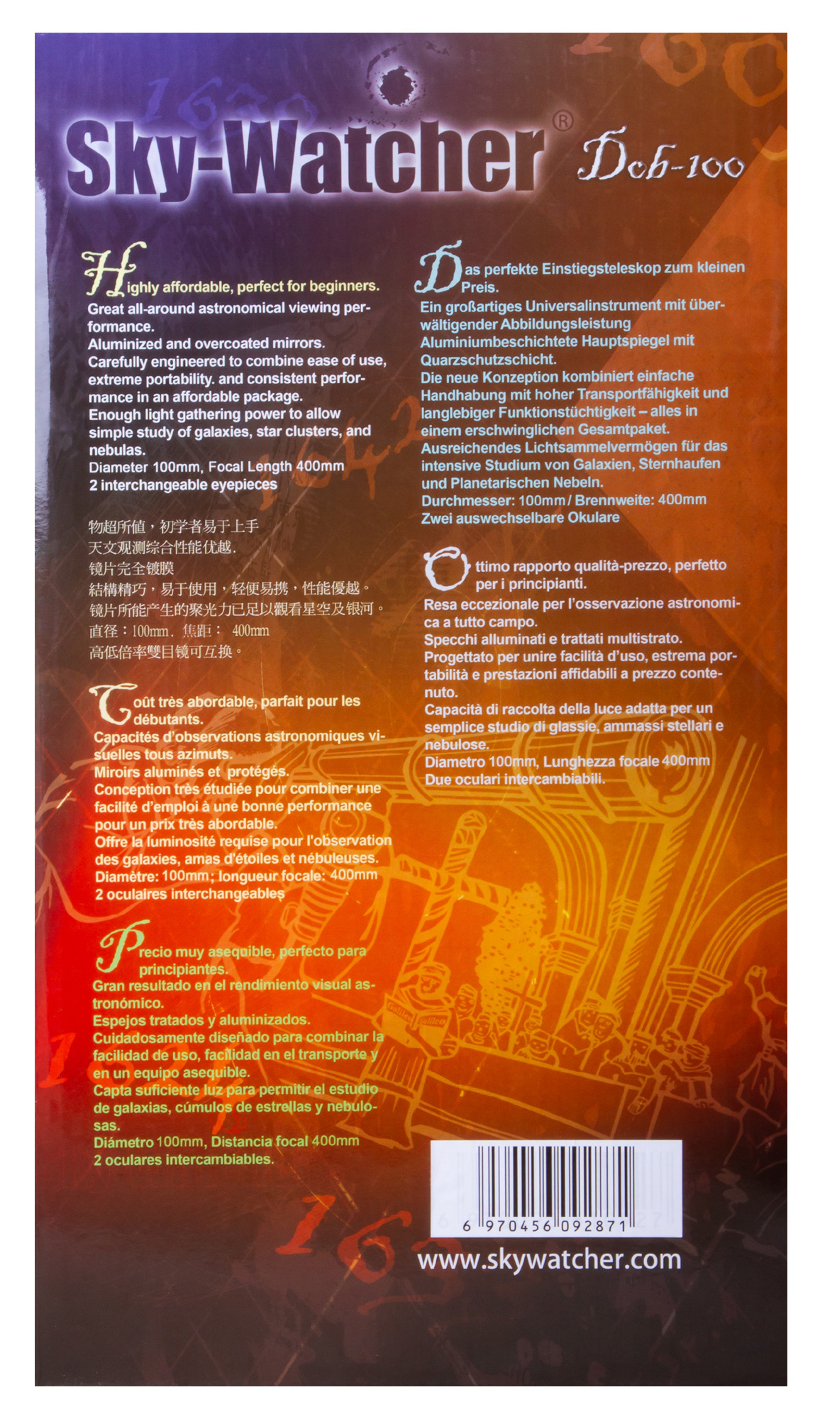 Sky-Watcher Dob 100/400 Heritage – это рефлектор Ньютона, который лучше всего показывает объекты дальнего космоса. Для их изучения в комплект поставки включены два окуляра и линза Барлоу. Благодаря им можно легко подобрать оптимальное для наблюдений увеличение – дополнительные аксессуары не понадобятся. Оптика телескопа также весьма эффективна при изучении Луны. Параболическое главное зеркало очищает передаваемую картинку от сферических искажений и позволяет видеть космос детально и четко.