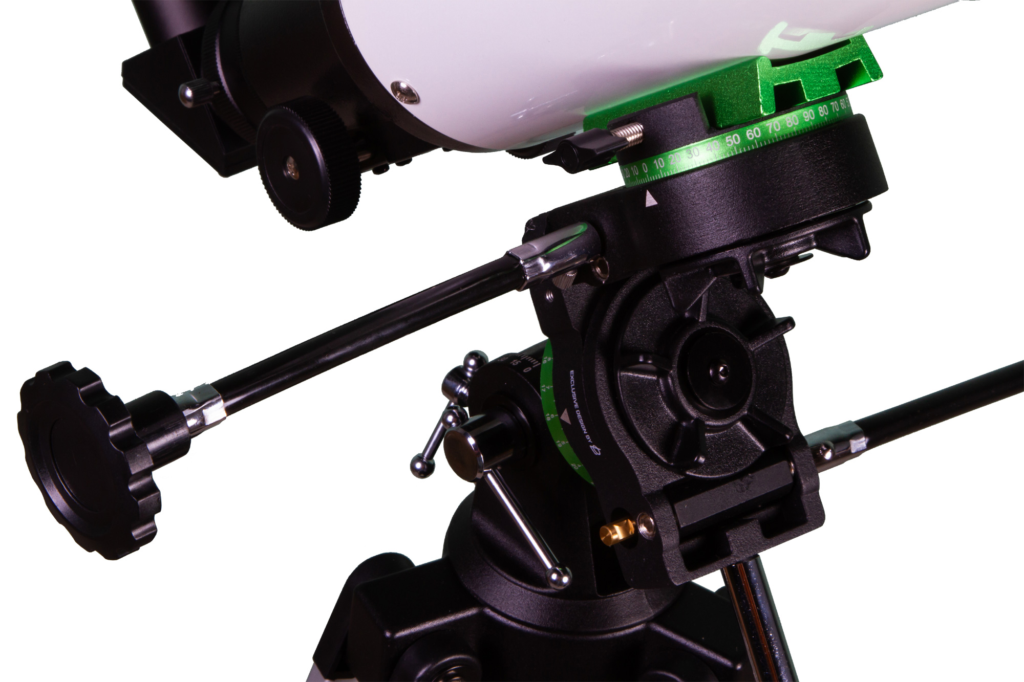 Экваториальная монтировка управляется двумя ручками тонких движений. Шестерни (122 зубца каждая) с червячными передачами обеспечивают плавный и точный ход, упрощают ведение объектов по небосклону. Крепление оптической трубы к монтировке – «ласточкин хвост». Сама монтировка устанавливается на алюминиевую треногу. Высота треноги регулируемая, есть лоток для аксессуаров.