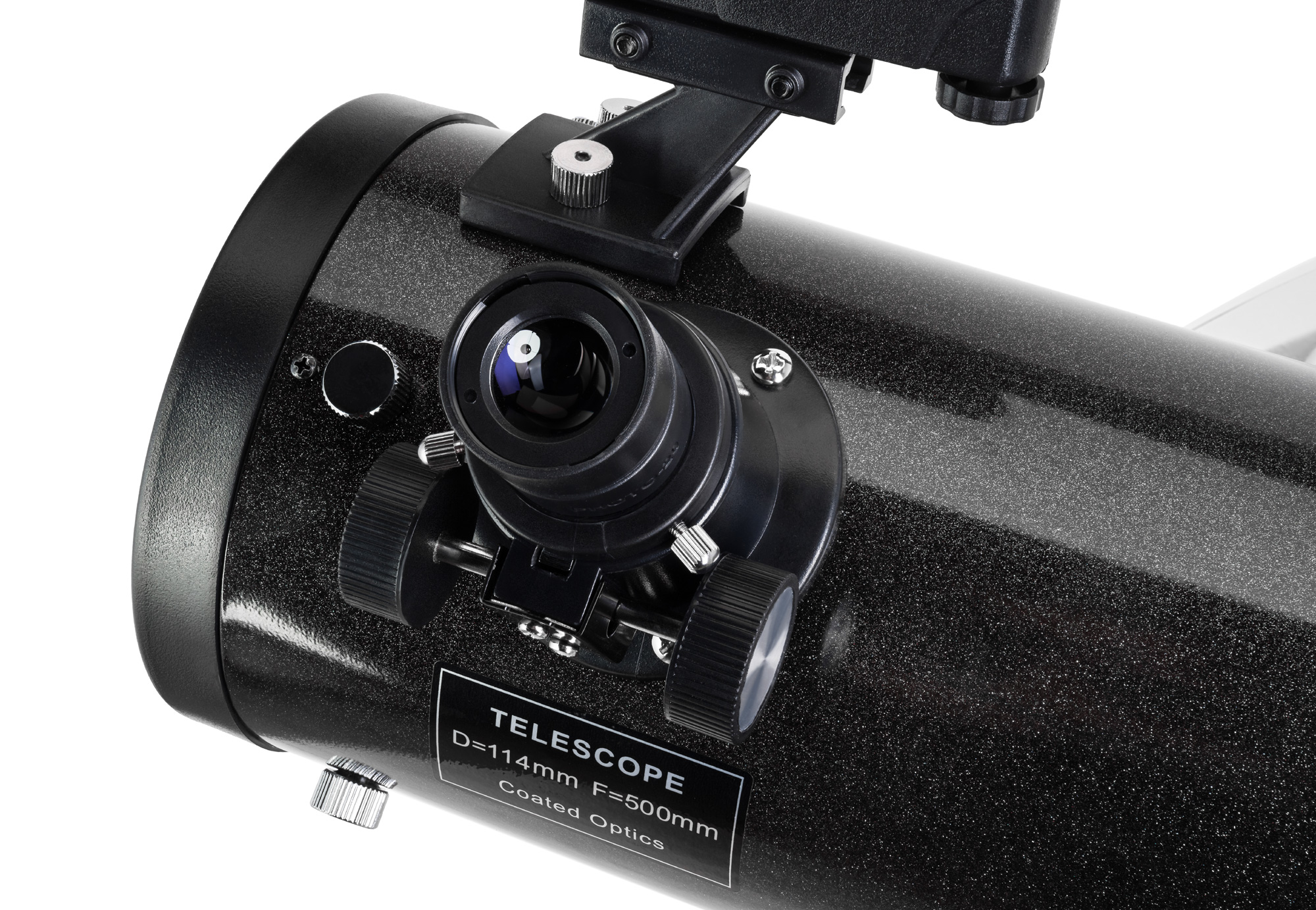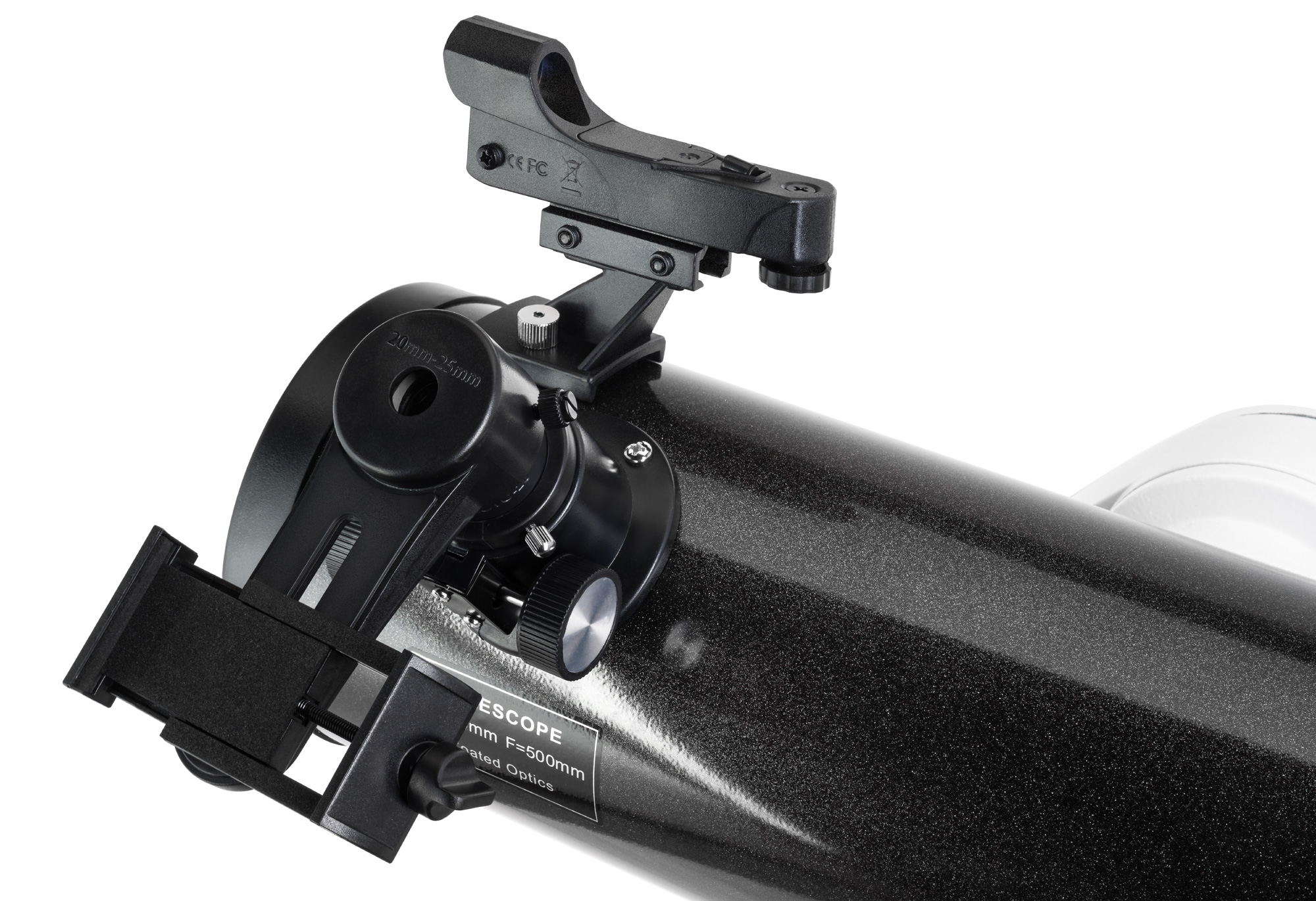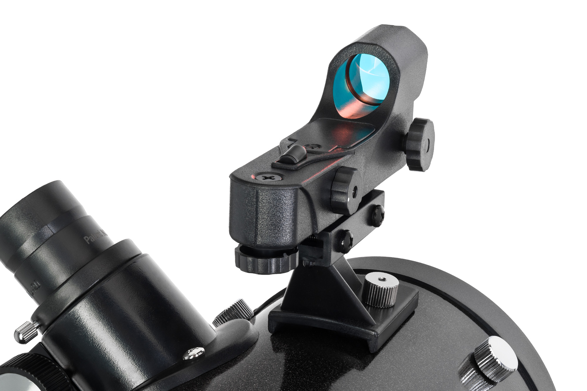 В основе оптической схемы лежит параболическое главное зеркало. Оно формирует контрастное и хорошо читаемое изображение на всем диапазоне полезного увеличения. Главное и вторичное зеркала защищены алюминиево-кварцевым покрытием, которое повышает коэффициент отражения до 94%. Также это покрытие продлевает срок службы зеркал и не дает им тускнеть со временем. На оптическую трубу устанавливается один из окуляров с посадочным диаметром 1,25 дюйма и искатель с красной точкой. При необходимости телескоп можно оснастить дополнительными аксессуарами подходящего типоразмера.