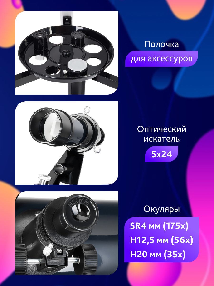В комплектации есть сменные окуляры и линза Барлоу, повышающая степень приближения оптики вдвое. Комбинируя эти аксессуары, можно экспериментировать с кратностью увеличения. В процессе наблюдений дополнительные принадлежности удобно размещаются на лотке треноги, высоту которой можно настраивать. Отдельно отметим книгу знаний «Космос. Непустая пустота» – это увлекательный путеводитель по космосу, который поможет приступить к процессу наблюдений, вооружившись базовыми астрономическими знаниями.