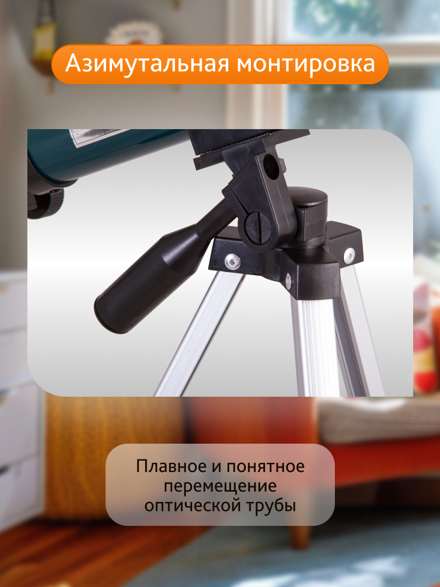 Телескоп установлен на азимутальную монтировку – управление телескопом не вызовет трудностей даже у самого юного ученого. Тренога изготовлена из алюминия, высоту ножек можно регулировать.