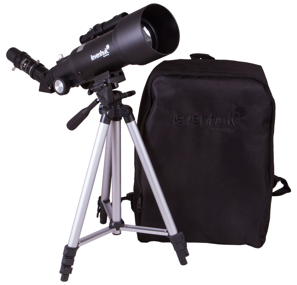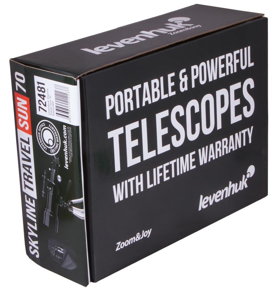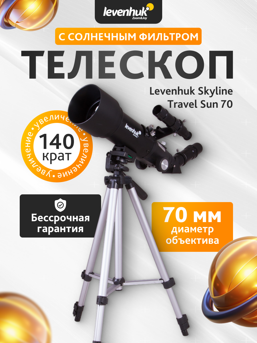 Телескоп Levenhuk Skyline Travel Sun 70 – светосильный рефрактор с апертурой 70 мм. Это портативный оптический прибор с облегченной и укороченной трубой. В комплект входит удобный фирменный рюкзак для телескопа – в него легко поместятся труба, монтировка, тренога и все необходимые аксессуары.