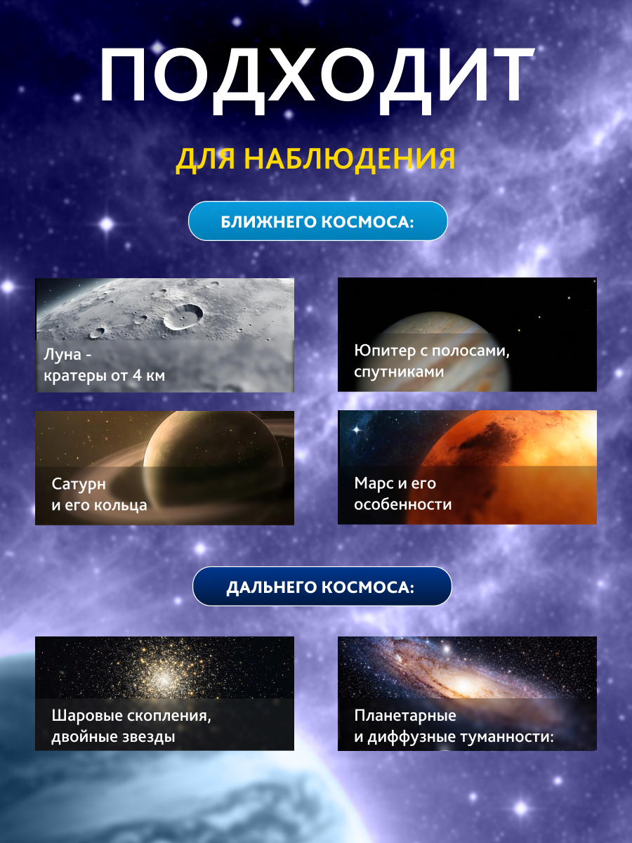 • Отличный выбор для изучения туманностей, галактик и звездных скоплений: можно наблюдать объекты каталогов Мессье и NGC