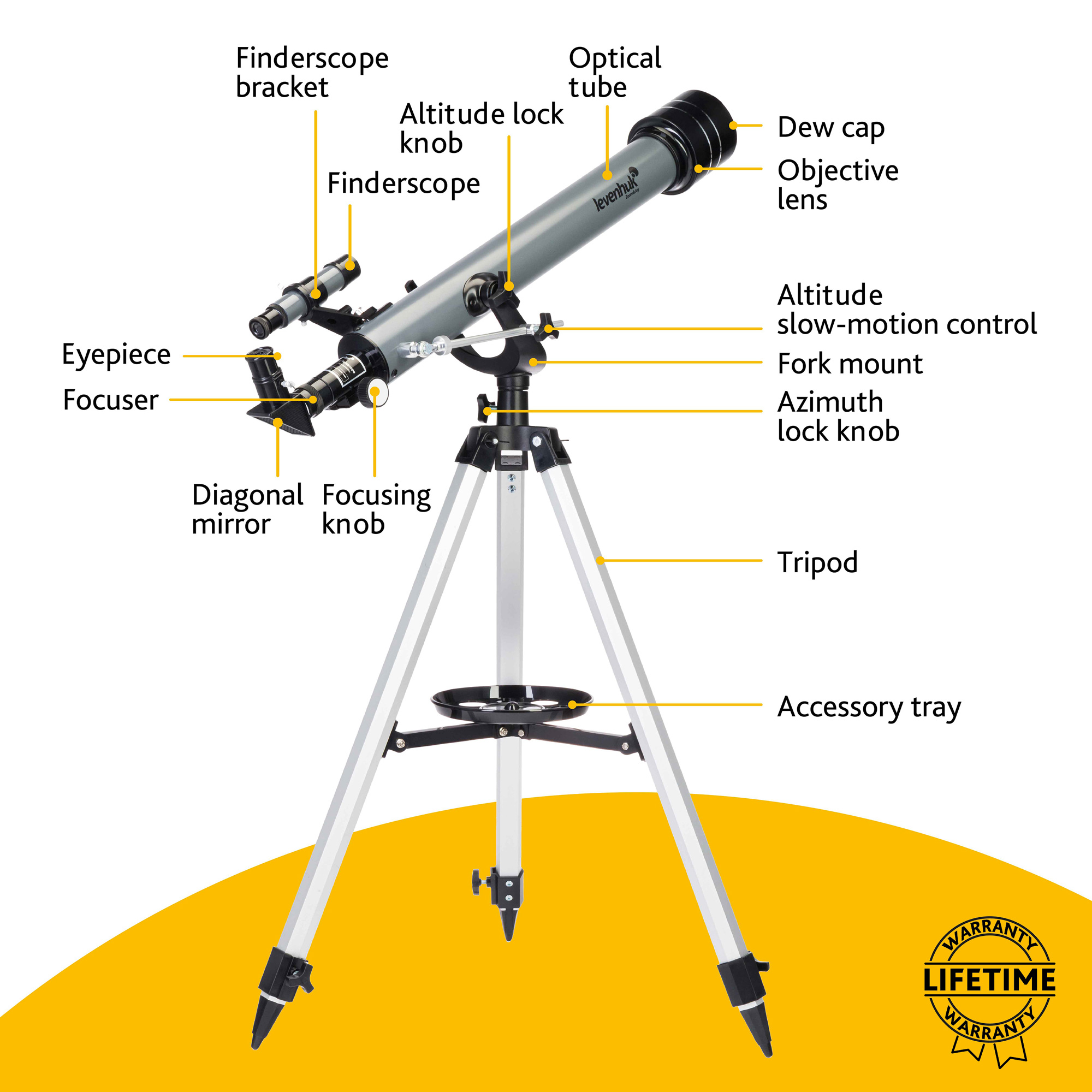Все линзы оптической схемы сделаны из стекла и дополнены антибликовым покрытием, поэтому телескоп строит ясное и четкое изображение без искажений. Труба установлена на вилочную азимутальную монтировку, на вертикальной оси которой есть микровинт. Он используется для более удобного и точного наведения на объекты. Тренога сделана из алюминия и снабжена полочкой для аксессуаров. При необходимости высоту ножек треноги можно регулировать.