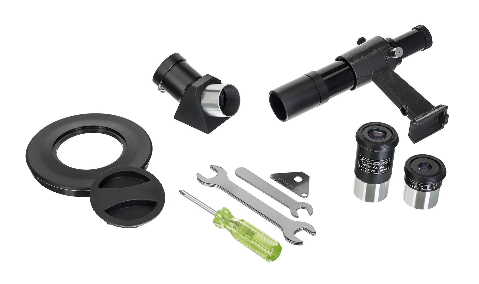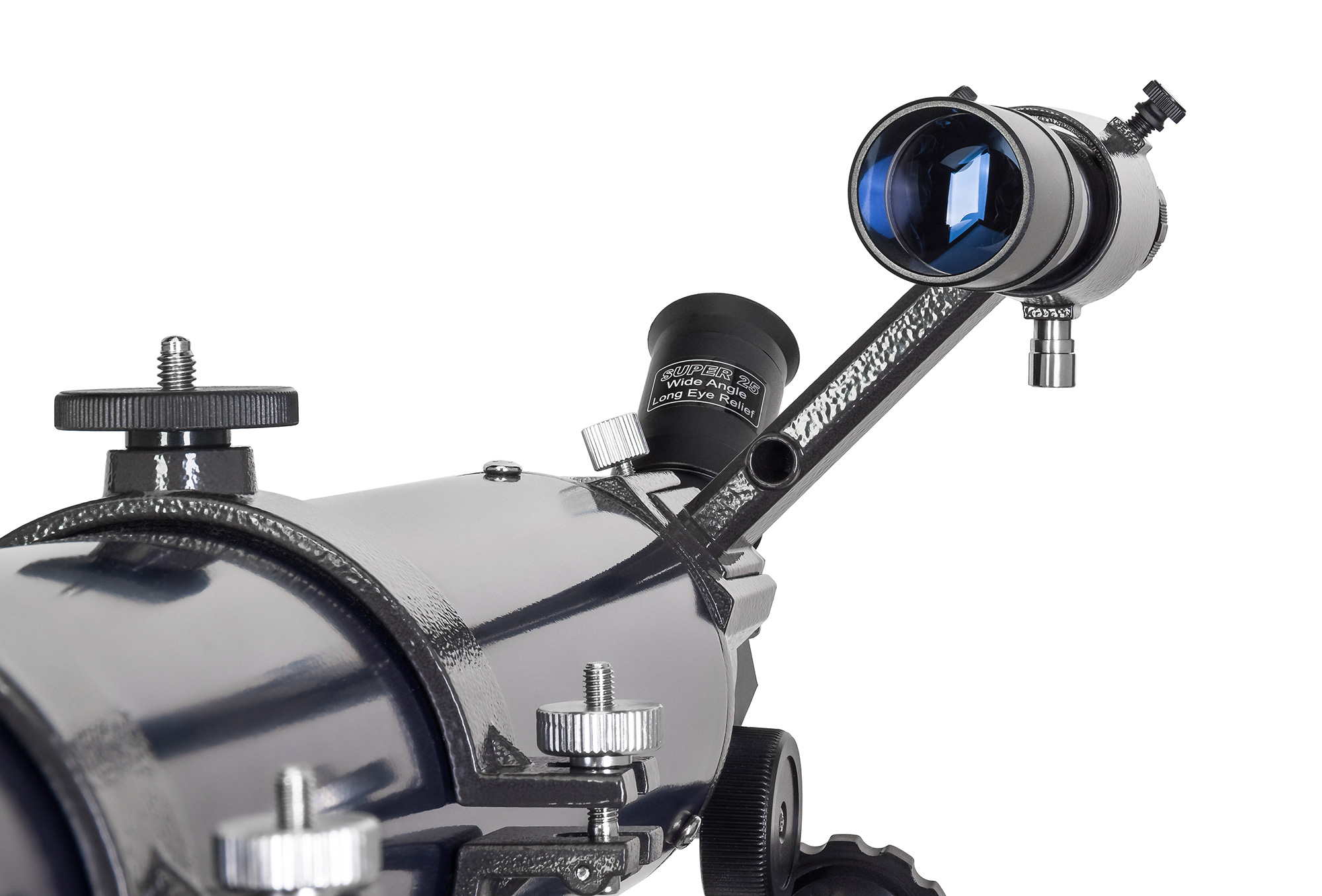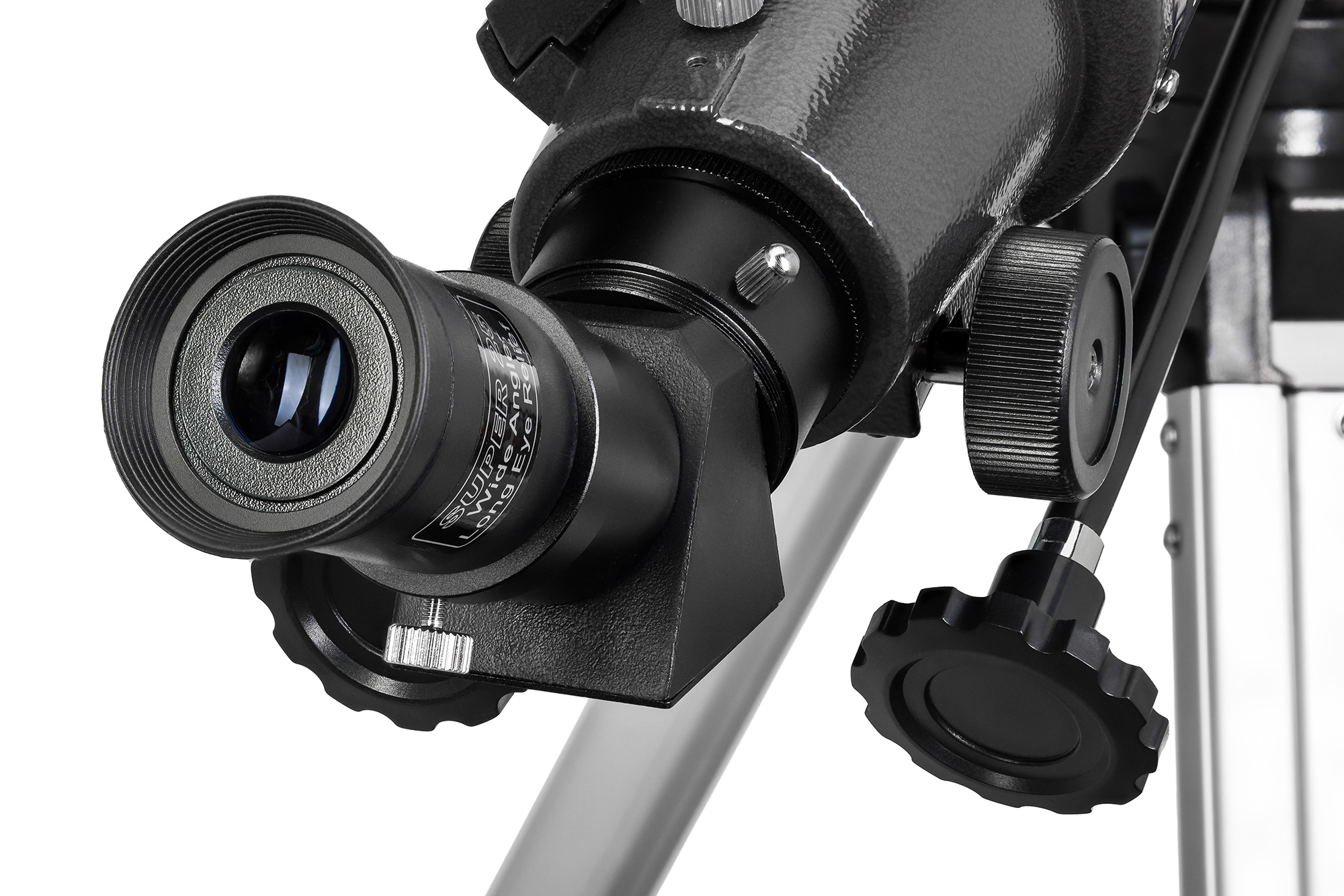 Диаметр объектива-ахромата составляет 90 мм, а все оптические элементы выполнены из стекла высокого качества с полным многослойным просветлением, поэтому телескоп передает яркое, контрастное и четкое изображение с минимумом искажений. При благоприятном состоянии атмосферы через телескоп можно увидеть очень тусклые объекты. В комплект уже включены окуляры 10 и 25 мм: первый дает на телескопе увеличение 90х и хорошо подходит для детального изучения планет, второй – это обзорный окуляр (увеличение 36х). Для удобства поиска объектов используется оптический искатель 6х30, а оборачивающая призма обеспечивает правильное прямое изображение, необходимое при изучении наземных ландшафтов.