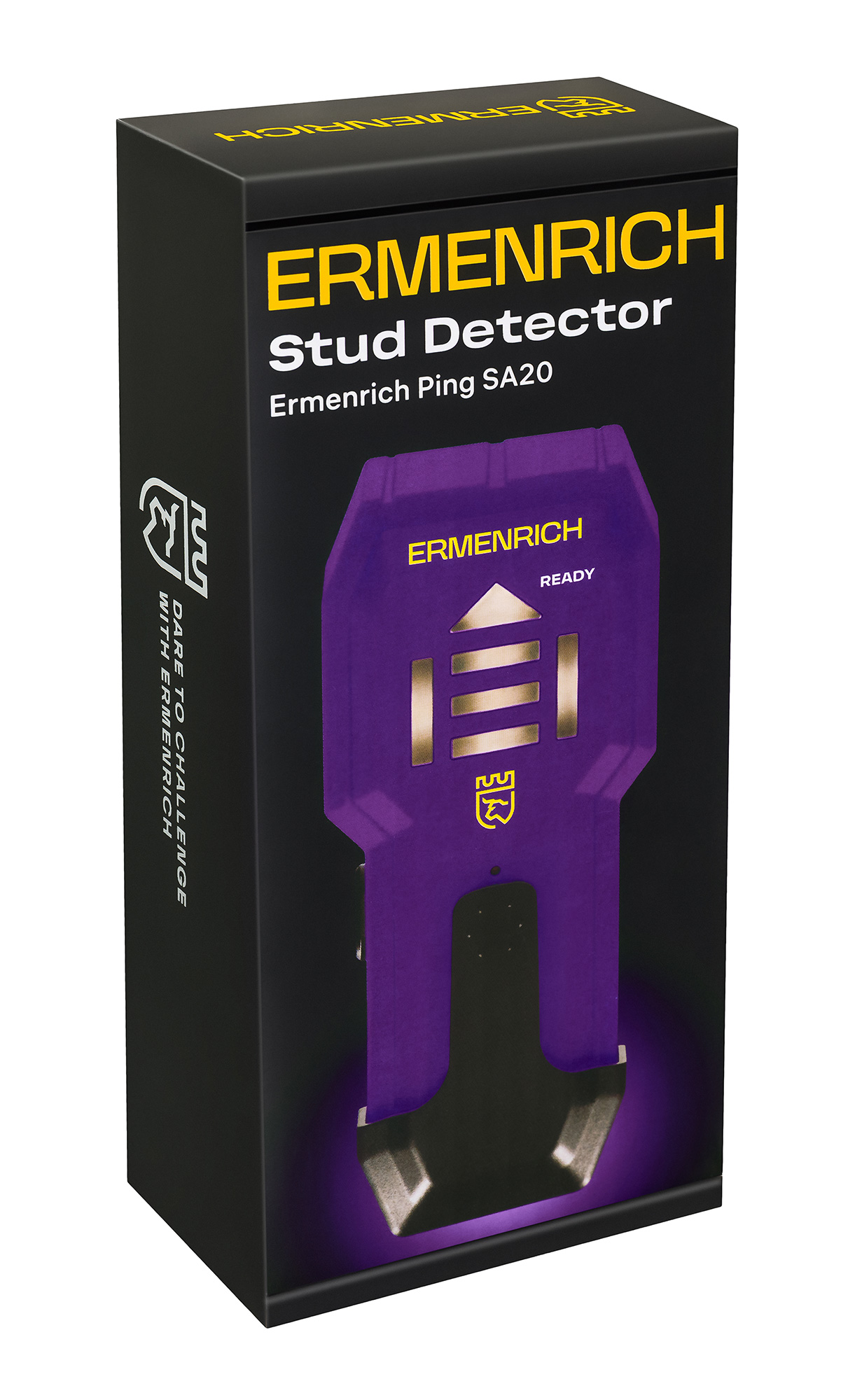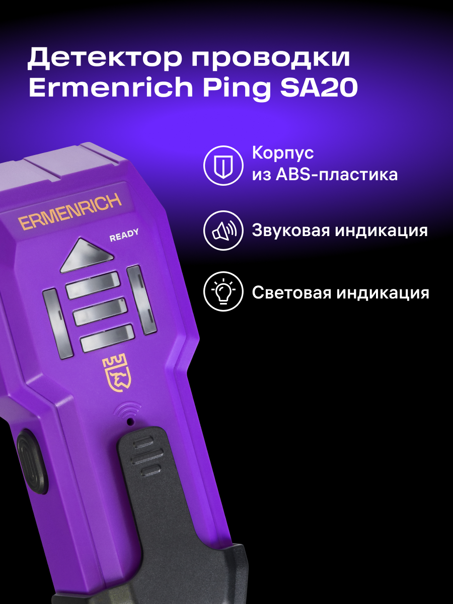 Ermenrich Ping SA20 – это компактный детектор проводки с функцией обнаружения деревянных и металлических конструкций в стенах. С его помощью можно безопасно проводить строительные и ремонтные работы: перепланировку квартир, монтаж кухонных шкафов, розеток и декоративных элементов. Максимальная глубина обнаружения составляет 19 миллиметров, прибор калибруется автоматически.