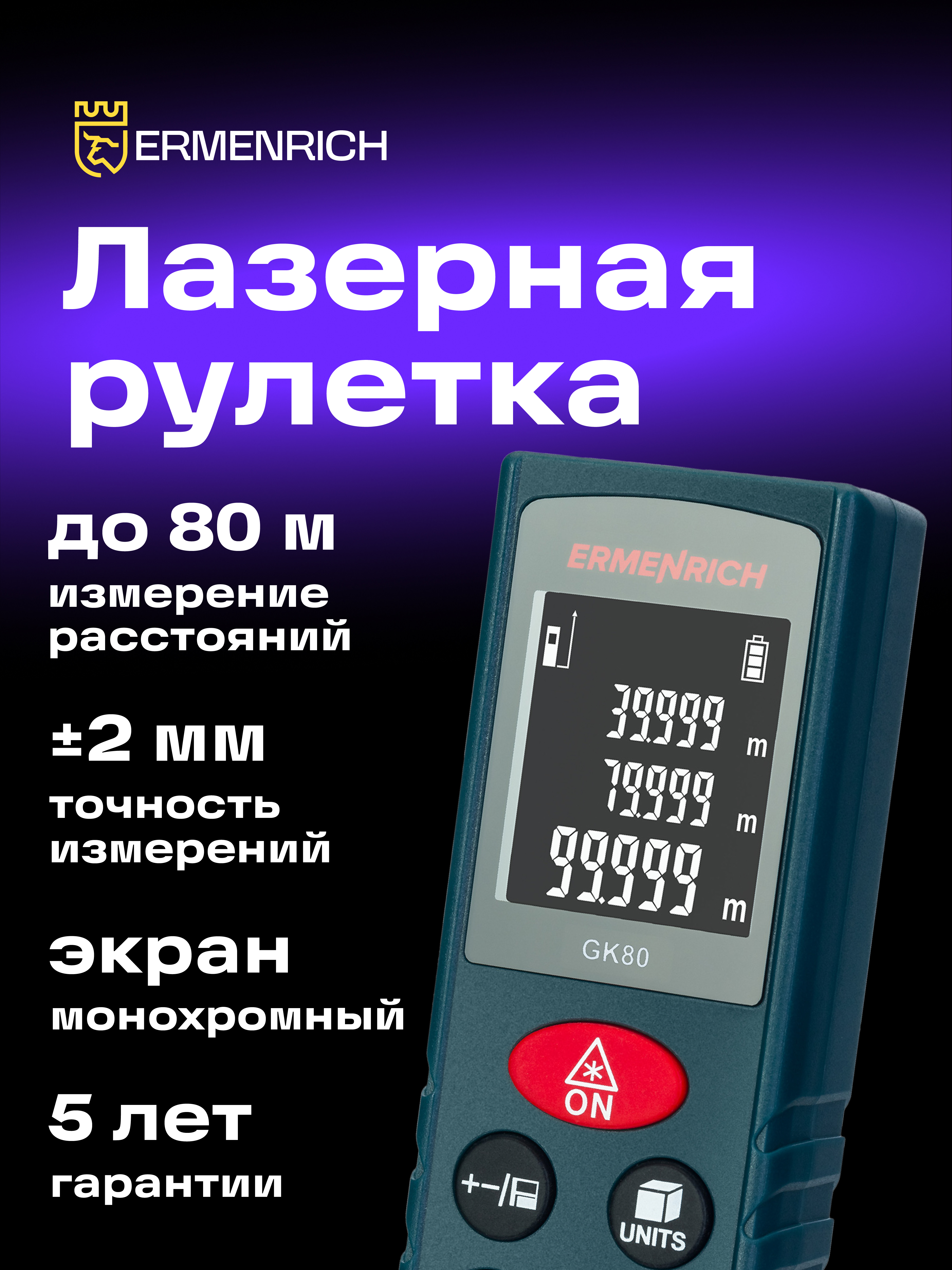 Лазерная рулетка Ermenrich Reel PLUS GK80 – современный инструмент, позволяющий делать точные замеры расстояний, вычислять площадь и объем, а также находить расстояние до труднодоступных точек с помощью функции «Пифагор». Эта функция вычисляет длину нужного отрезка с помощью косвенных измерений.