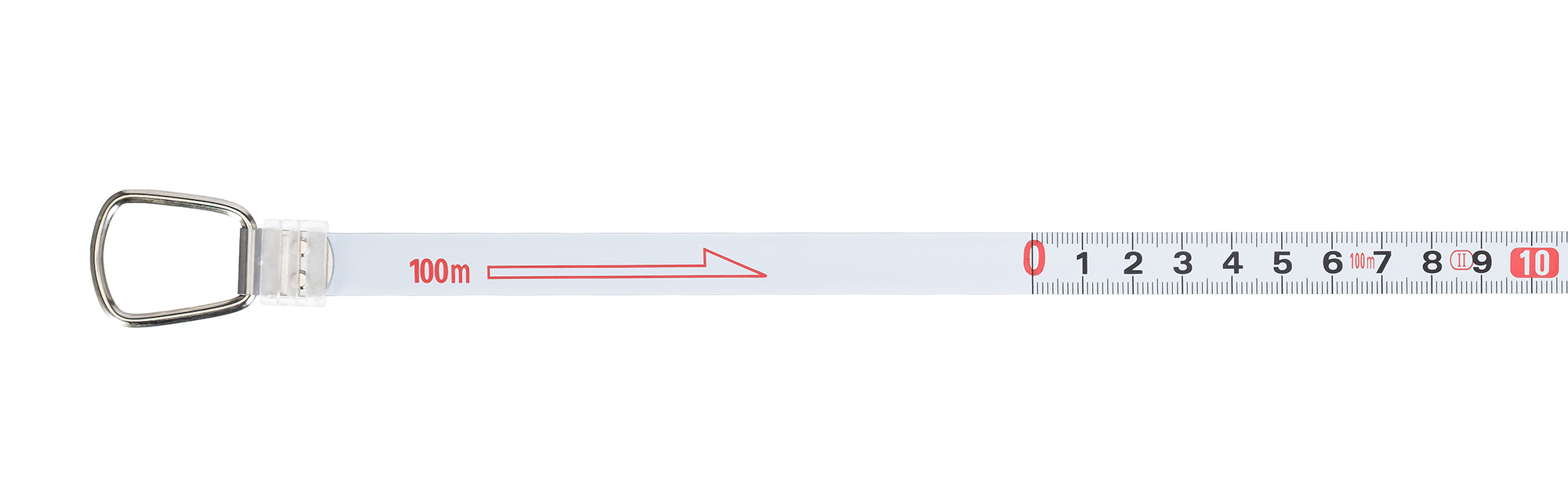 Деления и цифры белой ленты обозначены с одной стороны крупно и четко: их можно заметить даже издалека. Большим преимуществом этой модели является наличие блокиратора холостого хода у ручки для сматывания катушки с лентой. Таким образом, лента непредвиденно не свернется. Рукоять выполнена эргономично и дополнена вставкой из термопластичной резины, за счет чего инструмент не выскользнет из рук.