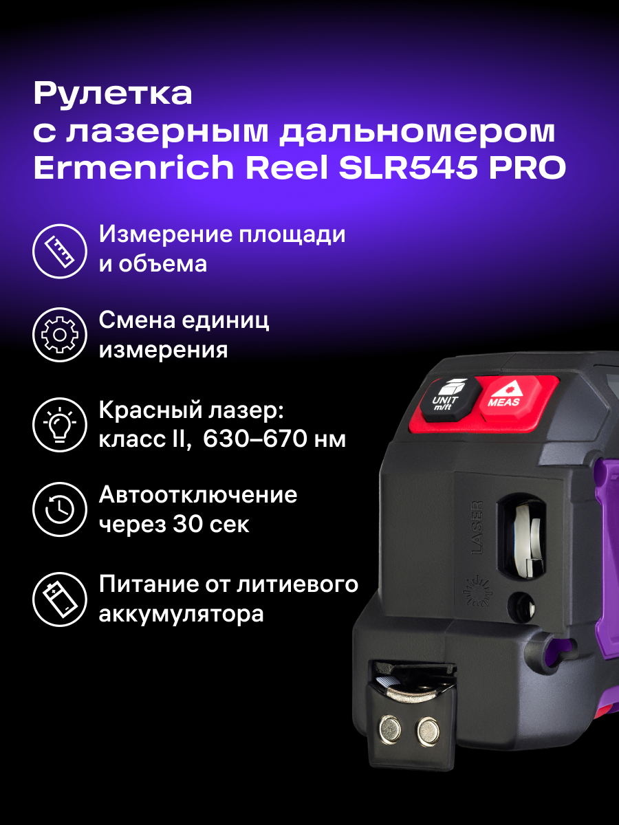 Рулетка с лазерным дальномером Ermenrich Reel SLR545 PRO представляет собой универсальный инструмент для измерения длин, площадей и объемов. Рулетка станет незаменимым помощником в строительстве, ремонтно-отделочных работах, ландшафтном дизайне и других сферах. Прибор работает от аккумулятора, для экономии заряда которого предусмотрена опция автоотключения через 30 секунд бездействия. Доступны три типа единиц измерения на выбор пользователя.
