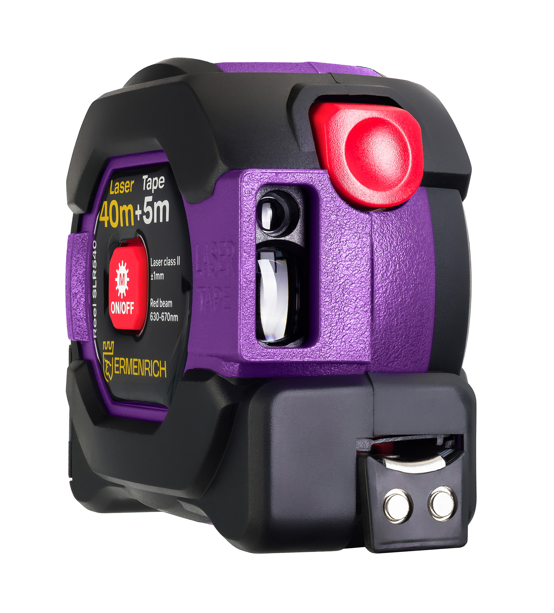 Лазер Ermenrich Reel SLR540 красного цвета, он работает в диапазоне до 40 метров и поддерживает сохранение замеров в памяти устройства. Измерительная лента имеет длину 5 метров и механизм автоблокировки. Она сделана из стали, свободный конец оснащен магнитным наконечником. Компактный корпус лазерной рулетки, сделанный из стойкого к ударам ABS-пластика, обрезинен для дополнительной защиты и снабжен поясным креплением. За питание прибора отвечают батарейки, есть функция автоотключения для экономного расходования заряда.Обратите внимание: модель в черном корпусе имеет одностороннее полотно, модель в фиолетовом корпусе – двухстороннее.