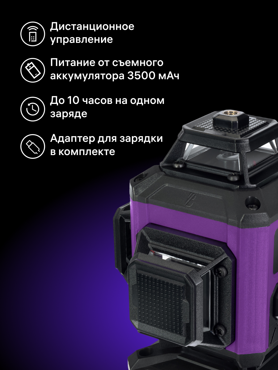Лазерный уровень способен работать до 10 часов без подзарядки, ударопрочен, имеет защиту IP54 от влаги и строительной пыли и не боится морозов до –10 °С, за счет чего эффективен для работ не только в помещении, но и на улице. Простоту и удобство эксплуатации и хранения гарантируют аксессуары, которыми модель комплектуется (микролифт, пульт управления, магнитное крепление, кейс и т. д.).