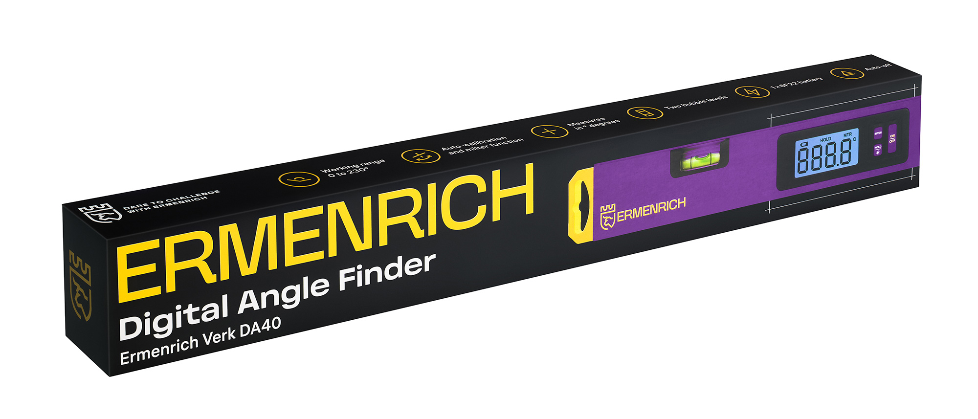 Угломер Ermenrich Verk DA40 проводит измерения в диапазоне 0–230 градусов. Корпус дополнен двумя встроенными пузырьковыми уровнями для точного позиционирования и отличается высокой прочностью: материалами для него послужили алюминий и ABS-пластик. Среди других преимуществ прибора – автоматическая калибровка и функция установки на ноль. Работает угломер от стандартной 9-вольтовой батарейки типа «Крона». Предусмотрена опция автоотключения, помогающая продлить срок работы прибора от одной батарейки.