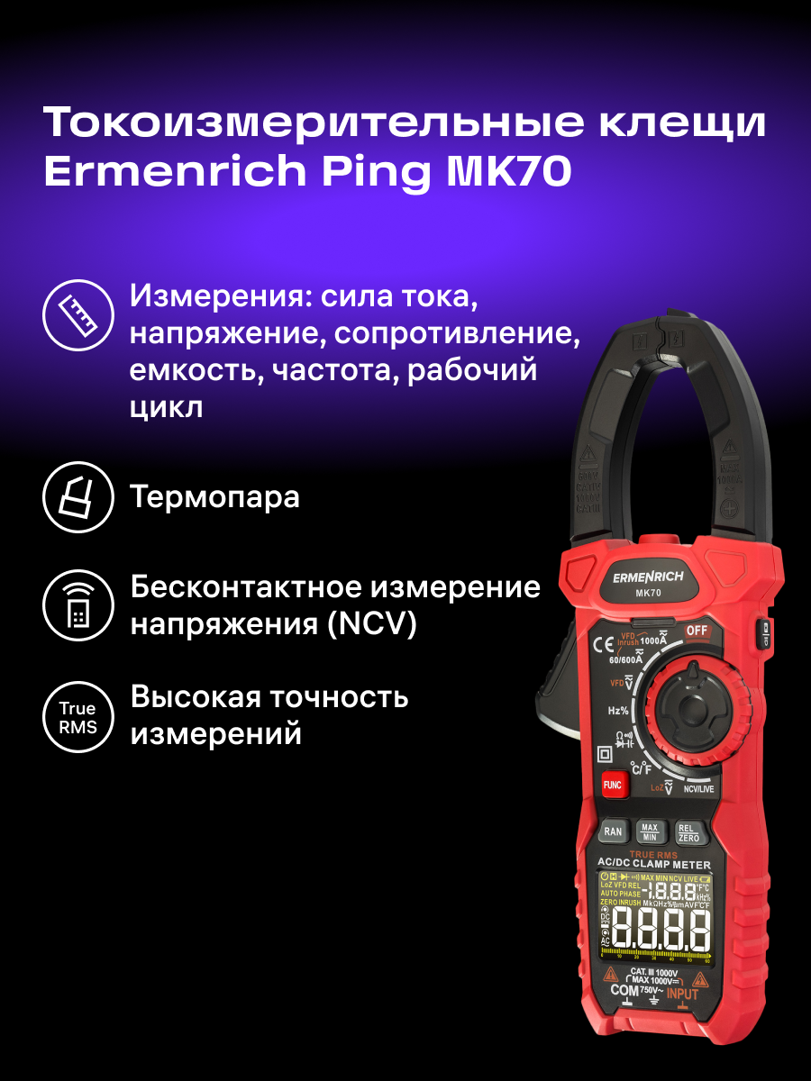 Токоизмерительные клещи Ermenrich Ping MK70 – портативный измерительный прибор для безопасного и быстрого определения силы тока, в том числе постоянного, без разрыва цепи. Этим устройством также можно измерять напряжение, сопротивление, электрическую емкость, частоту, рабочий цикл. Благодаря термопаре можно измерять температуру с отображением результата в °C или °F. С помощью токовых клещей Ermenrich Ping MK70 находят обрывы и короткие замыкания в кабельной линии, пробои и обрывы диодов, обнаруживают провода под напряжением, скрытые в полу или в стене (функция NCV).