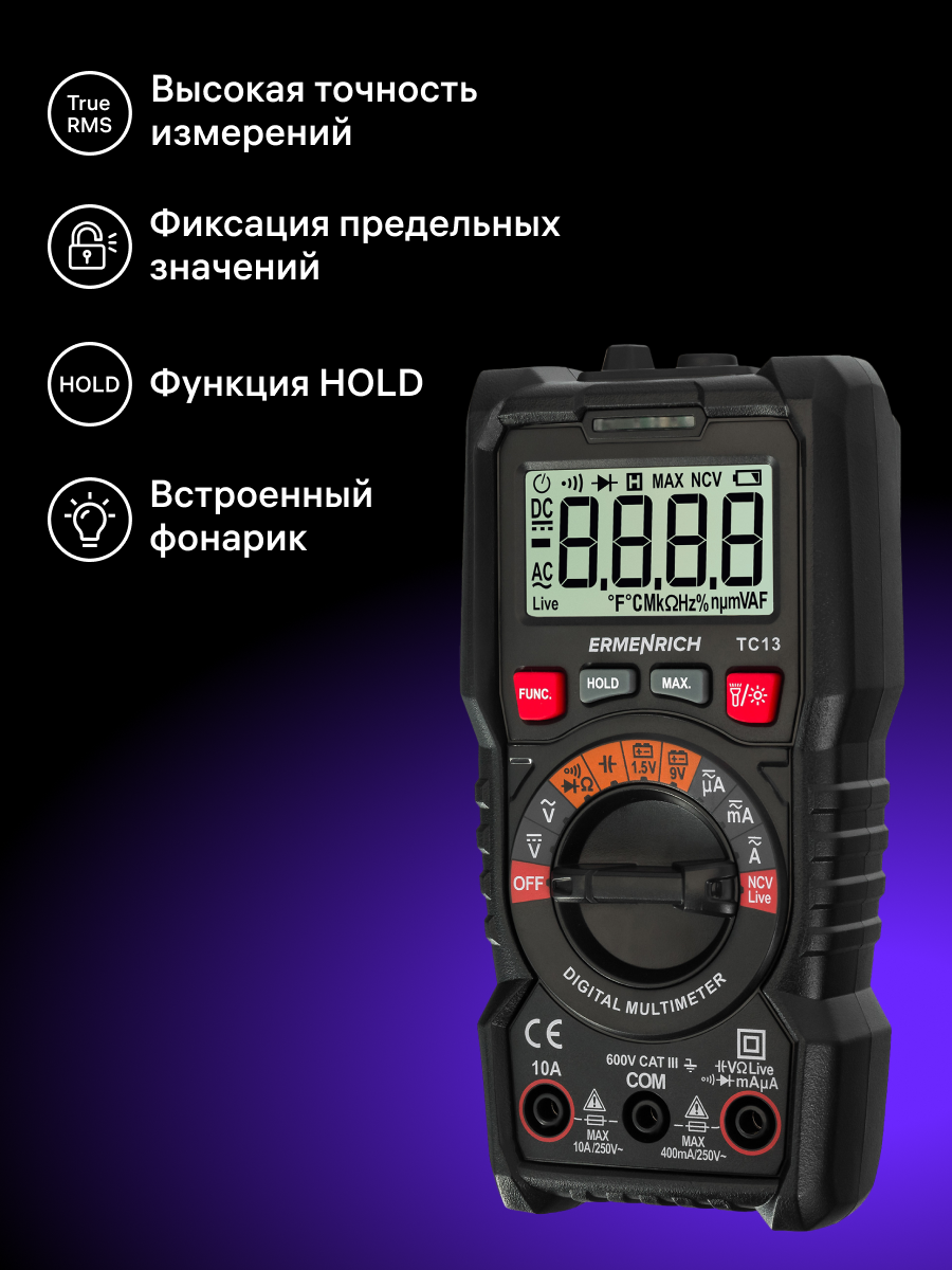 Ermenrich Zing TC13 – портативный цифровой измеритель для измерения силы тока, напряжения и сопротивления, а также частоты, емкости и рабочего цикла. Кроме того, с его помощью можно определять обрывы и пробои диодов, короткое замыкание, обрыв кабеля. Есть функция бесконтактного обнаружения скрытой проводки под напряжением. Мультиметр оснащен ЖК-дисплеем для отображения режимов работы и результатов измерений.