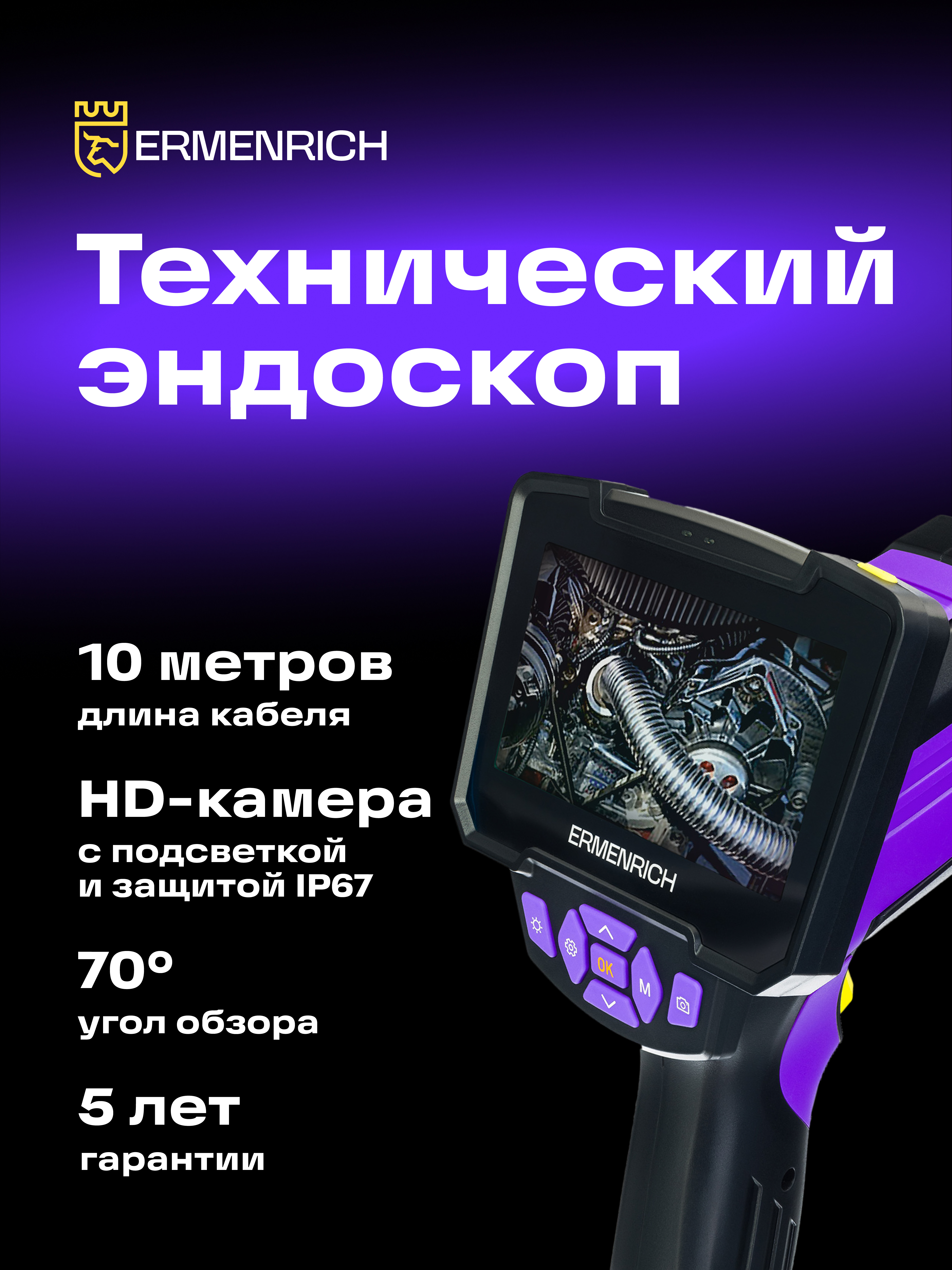 Эндоскоп Ermenrich Seek VE50 с одной камерой прямого обзора и полужестким кабелем длиной 10 м. Диаметр камеры всего 5,5 мм, и она легко проходит в труднодоступные места. Угол обзора составляет 70°, благодаря подсветке 8 светодиодами изображение получается четким. Эндоскоп рекомендуется использовать для диагностики канализационных и вентиляционных труб, осмотра стен на наличие трещин, выявления неисправностей в промышленном оборудовании. Степень герметичности камеры IP67, поэтому можно осматривать объекты под водой, например, при аварийном ремонте канализации или водопровода.