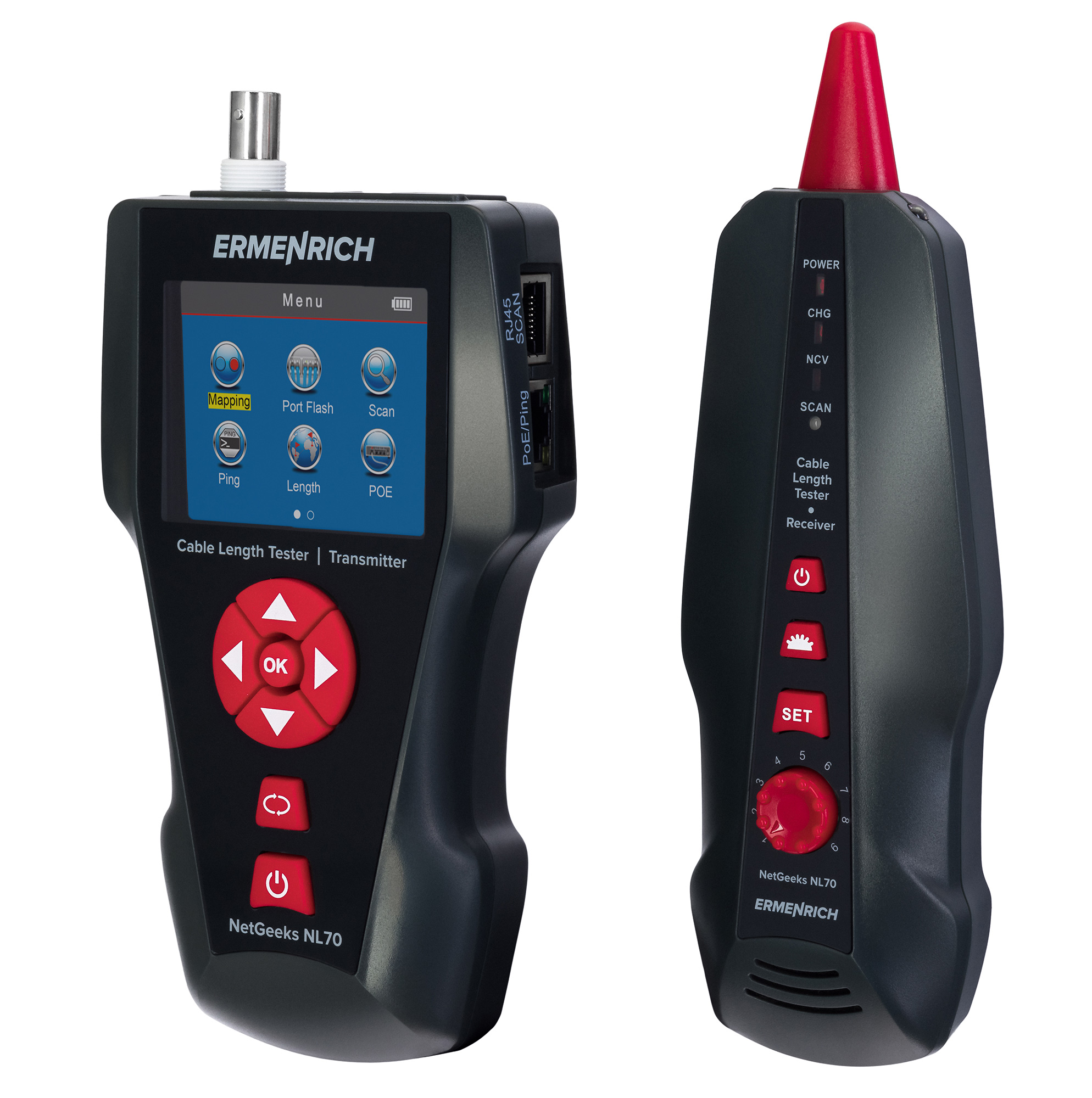 Используя Ermenrich NetGeeks NL70, можно обнаружить различные неисправности в электросети: короткое замыкание, обрыв линии, а также перекрещенные, расщепленные и перевернутые пары кабелей. Есть возможность определить, на каком расстоянии находится проблемное место. С помощью функции трассировки находят нужный кабель и определяют его направление. Порт подключения определяют с помощью функции Port Flash (проблесковая индикация). Прибор также позволяет выполнять тест PoE (проверку соединения Ethernet) и PING-тест (проверку скорости интернет-соединения), при этом результат можно сохранить на карту памяти.