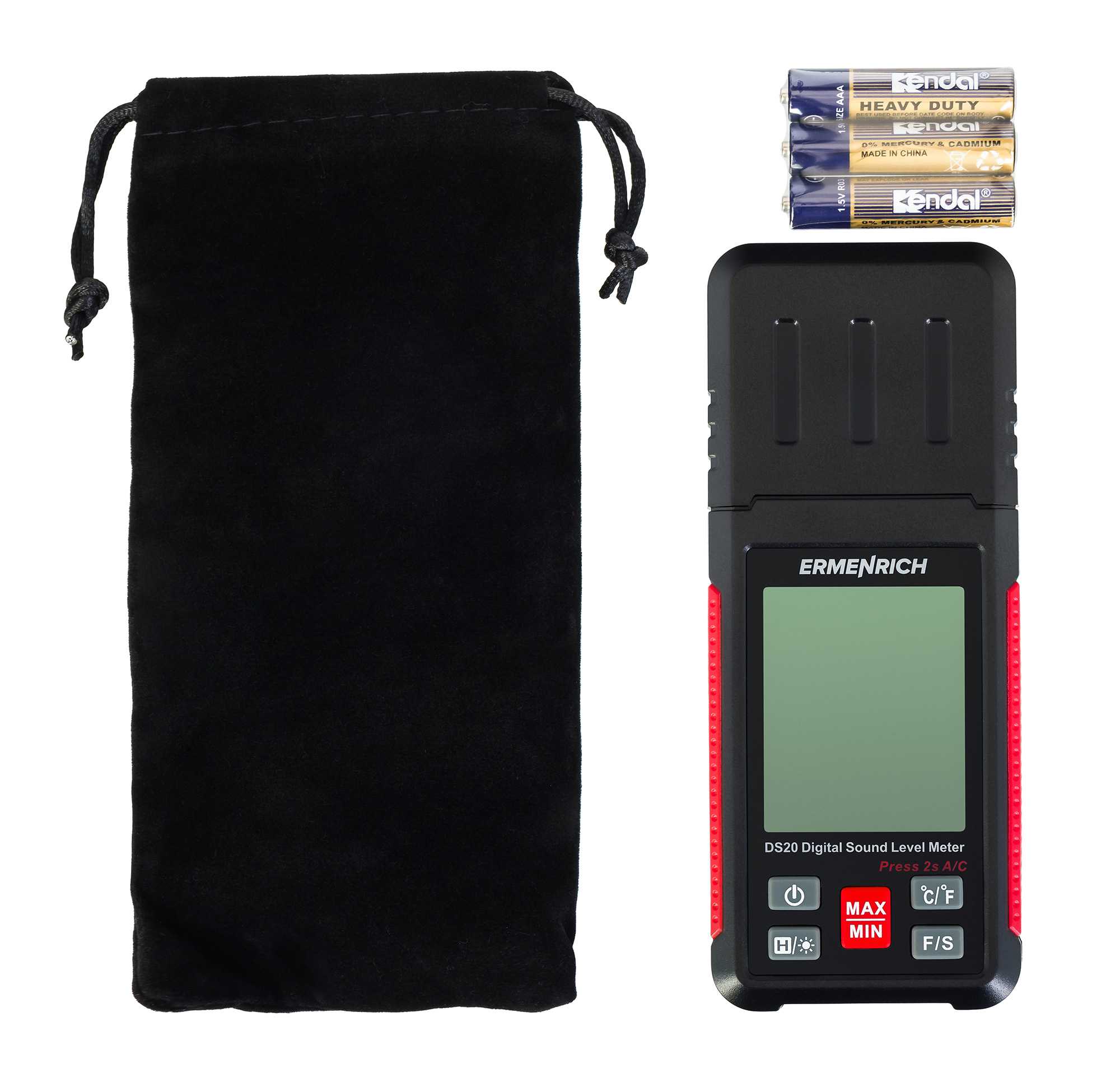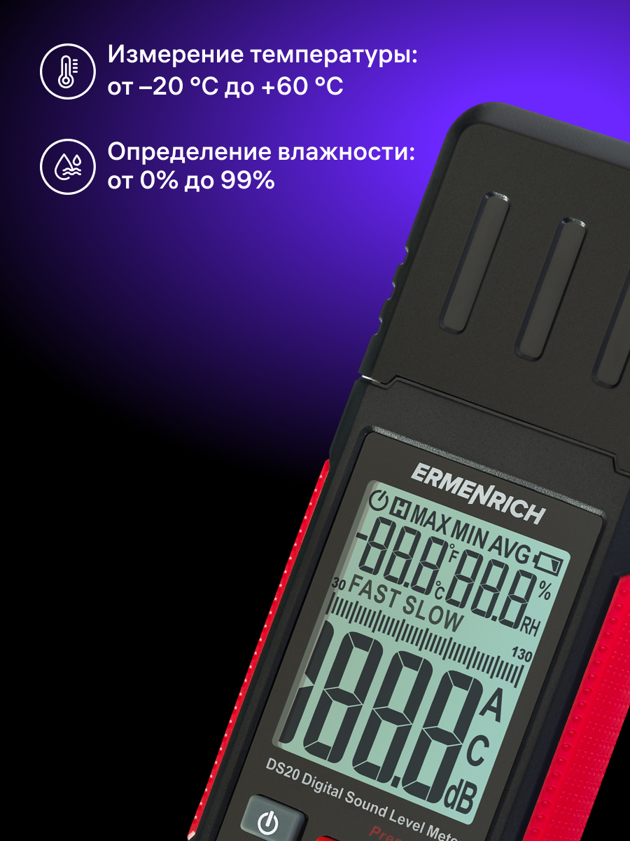 Шумомер Ermenrich Seek DS20 имеет встроенный гигрометр и термометр, что позволяет использовать один прибор для измерения сразу трех параметров окружающей среды. Благодаря этому он идеально подходит для таких задач, как контроль условий труда или проживания.