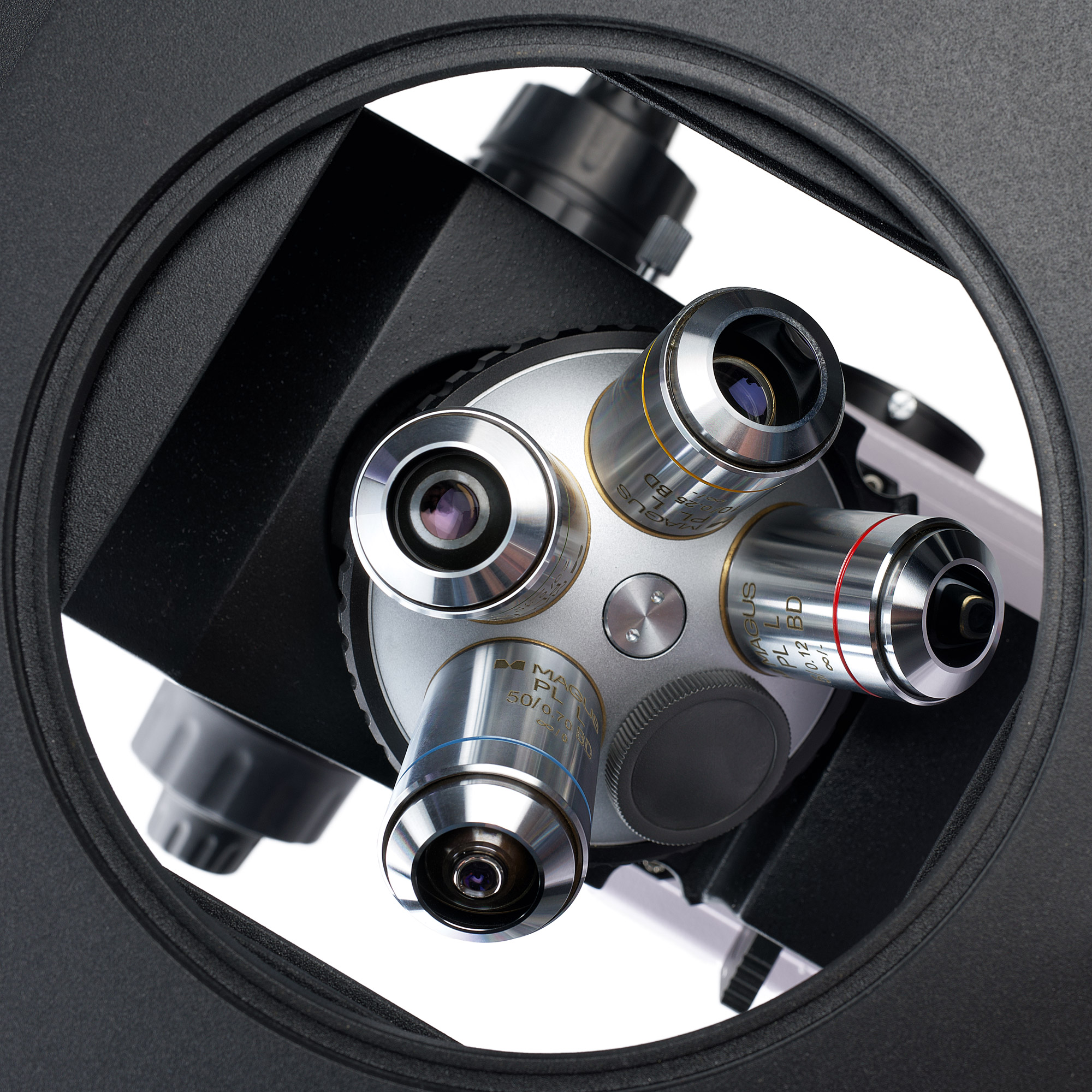 Револьверное устройство находится под образцом, для установки объективов доступно 5 гнезд. После установки объективов, входящих в комплект, одно гнездо револьвера остается свободным, поэтому при использовании дополнительного объектива не придется снимать один из базовых. Объективы планахроматические, имеют увеличенное рабочее расстояние и сконструированы для работы в светлом и темном поле. Увеличение микроскопа в базовой комплектации составляет от 50 до 500 крат.
