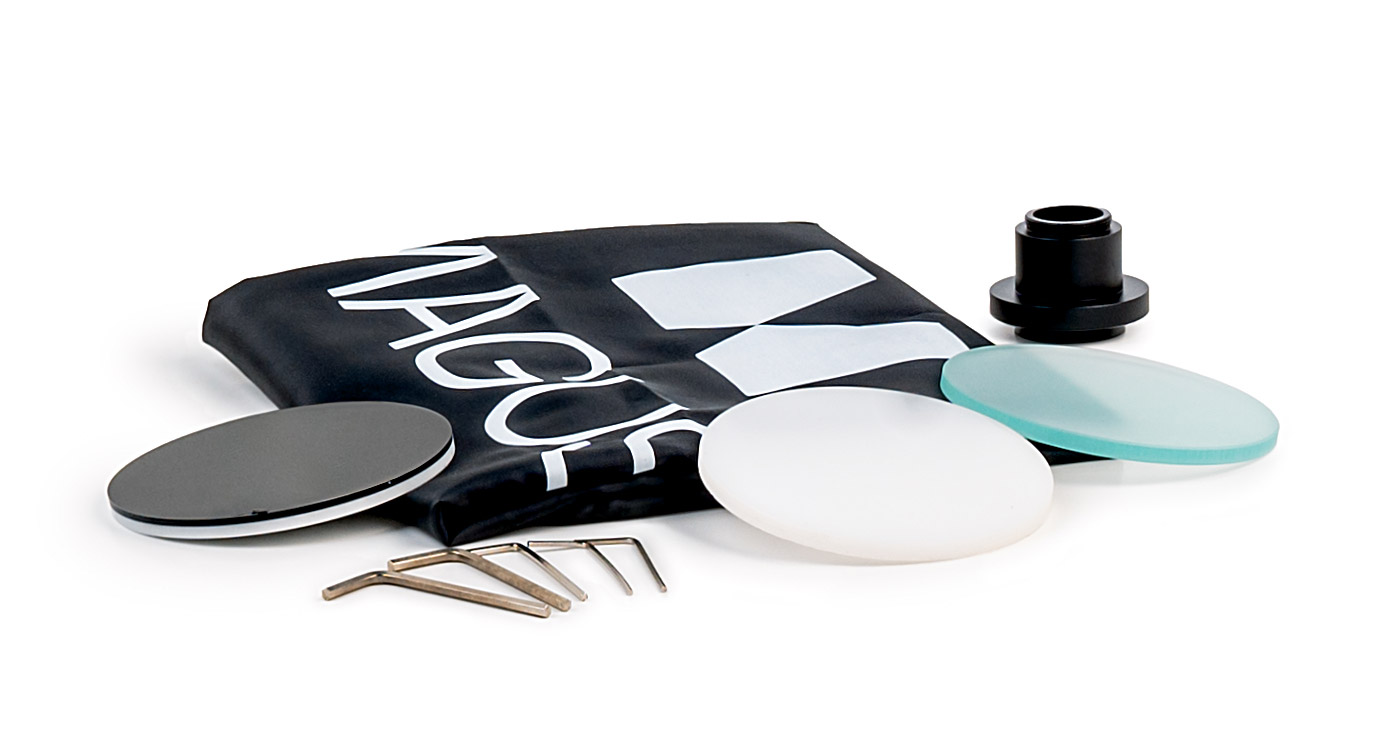 В комплектацию включены вставные пластины для предметного столика. Для наблюдения прозрачных и полупрозрачных образцов используются прозрачная и белая пластины. Они обеспечивают оптимальное рассеивание света и достаточную яркость для работы. Для наблюдения непрозрачных образцов применяют пластину со сторонами разного цвета: на черной стороне изучают светлые объекты, на белой – темные. Так достигается высокая контрастность изображения.