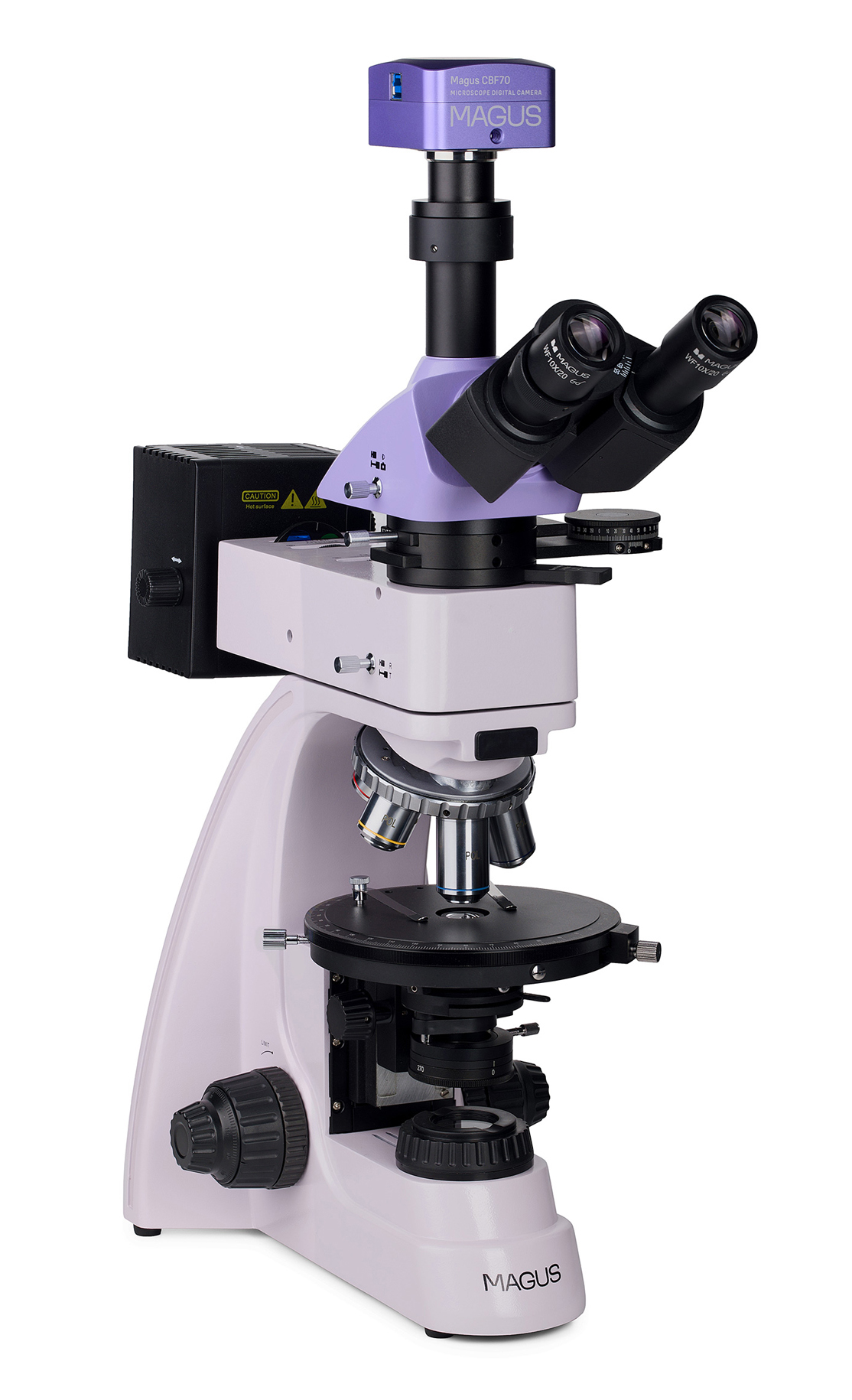 Микроскоп предназначен для исследования объектов в поляризованном и обычном свете. В проходящем свете изучают геологические шлифы, тонкие анизотропные биологические и полимерные объекты. В отраженном свете исследуют непрозрачные аншлифы с отполированной одной стороной. Толщина аншлифа произвольная, обычно 5–10 мм. Микроскоп позволяет изучать непрозрачные объекты толщиной до 15 мм. Для формирования изображения поляризационный микроскоп использует оптическое свойство двойного лучепреломления анизотропных объектов. Плоско-поляризованный свет при прохождении через анизотропный образец расщепляется на два луча и меняет плоскость поляризации. Анализатор приводит колебания лучей в одну плоскость, где они интерферируют. Яркое высококонтрастное изображение меняет цвет при вращении столика. Объективы микроскопа свободны от внутренних напряжений. В промежуточном тубусе установлены анализатор и линза Бертрана, есть слот для установки компенсаторов. Микроскоп используется в кристаллографии, петрографии, минералогии, криминалистике, медицине и других областях науки. **Цифровая камера** MAGUS CBF70 – научная камера с разрешением 21 Мпикс и матрицей 4/3" для работы по методу светлого поля. Камера формирует реалистичное изображение в разрешении 5280x3956 пикс. Камера рекомендуется для работы с объективами 4х, 10х, 20х и 40х. При работе с объективами малого увеличения камера позволит различить больше мелких деталей.
