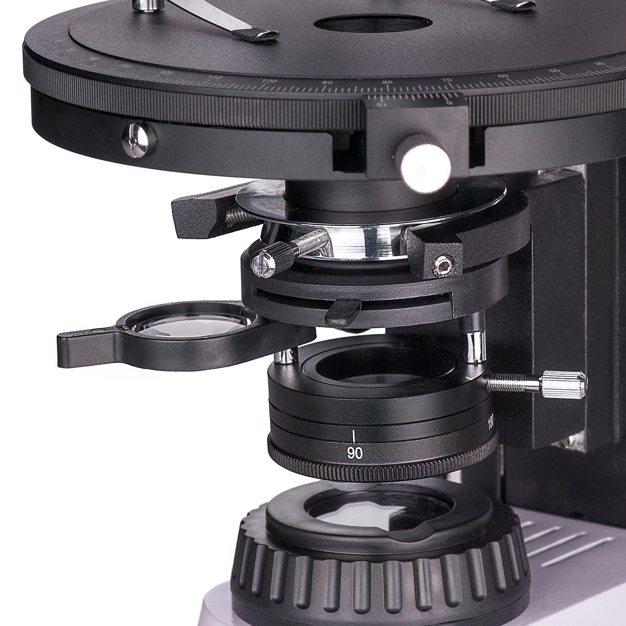 Объективы микроскопа свободны от внутренних напряжений. В промежуточном тубусе установлены анализатор и линза Бертрана, есть слот для установки компенсаторов.