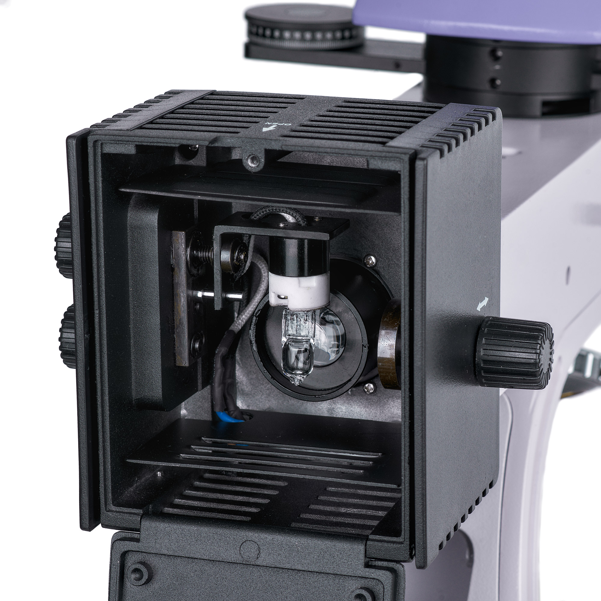 В осветителях отраженного и проходящего света стоят 30-ваттные галогенные лампы. Галогенные лампы излучают свет, комфортной для глаз цветовой температуры. 30-ваттная лампа светит достаточно ярко для работы на объективах увеличением от 4х до 100х в светлом поле и в поляризованном свете.Осветительная система отраженного света