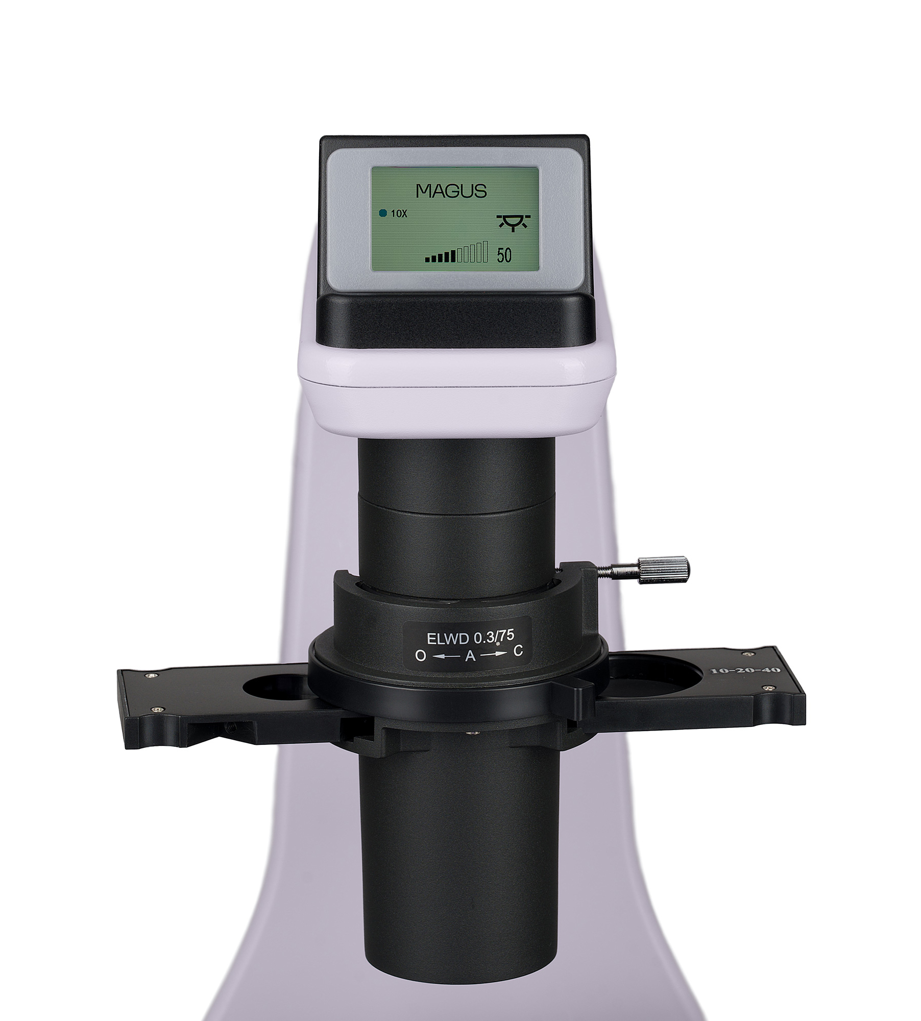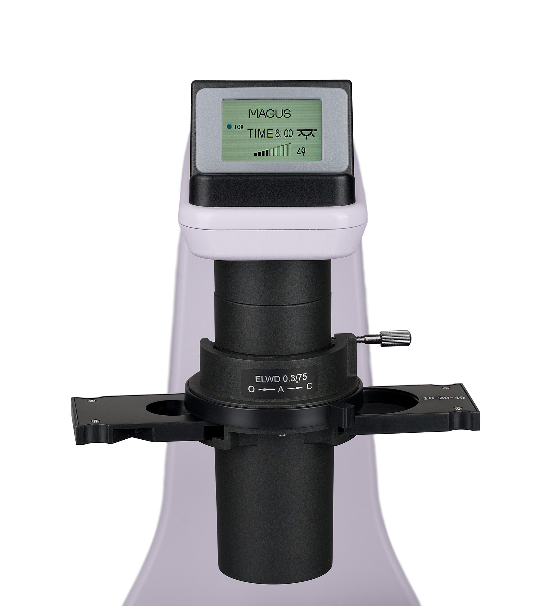 ЖК-экран на основании микроскопа отображает увеличение объектива, яркость источника света, режим работы («сон», «эко»).