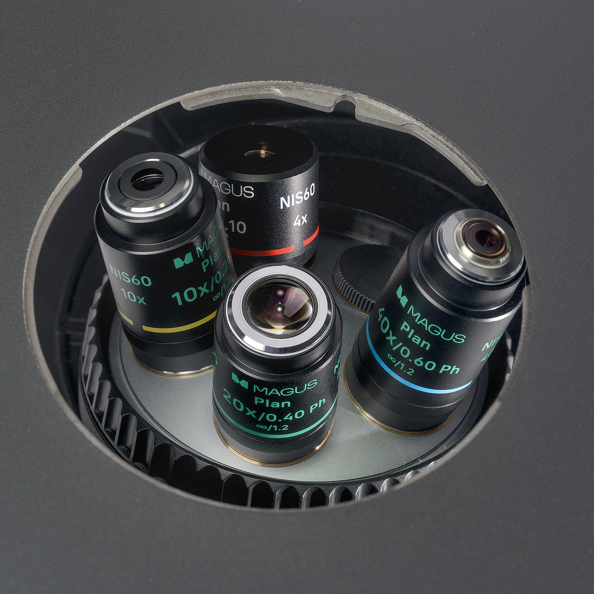 Объективы 10х, 20х и 40х являются фазовыми, они отличаются от объектива 4х наличием в плоскости выходного зрачка фазового кольца. Эти объективы предназначены для работы в фазовом контрасте, но также подходят для работы в светлом поле и по методу рельефного контраста (Emboss contrast).Сохранение комфортной яркости при смене увеличений