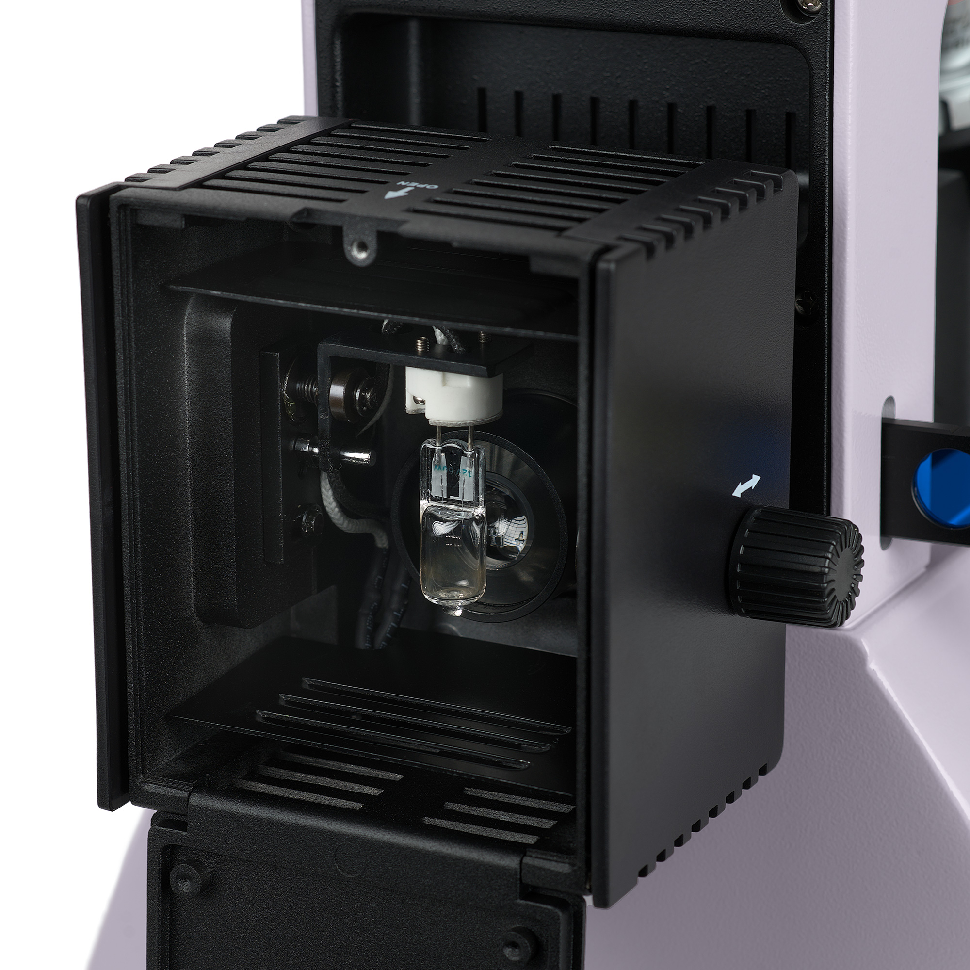 В фонаре стоит 50-ваттная галогенная лампа. Она светит достаточно ярко для работы на объективах увеличением от 4х до 100х в светлом поле, поляризованном свете и дифференциально-интерференционном контрасте. Галогенная лампа излучает свет, комфортной для глаз цветовой температуры.Осветительная система отраженного света
