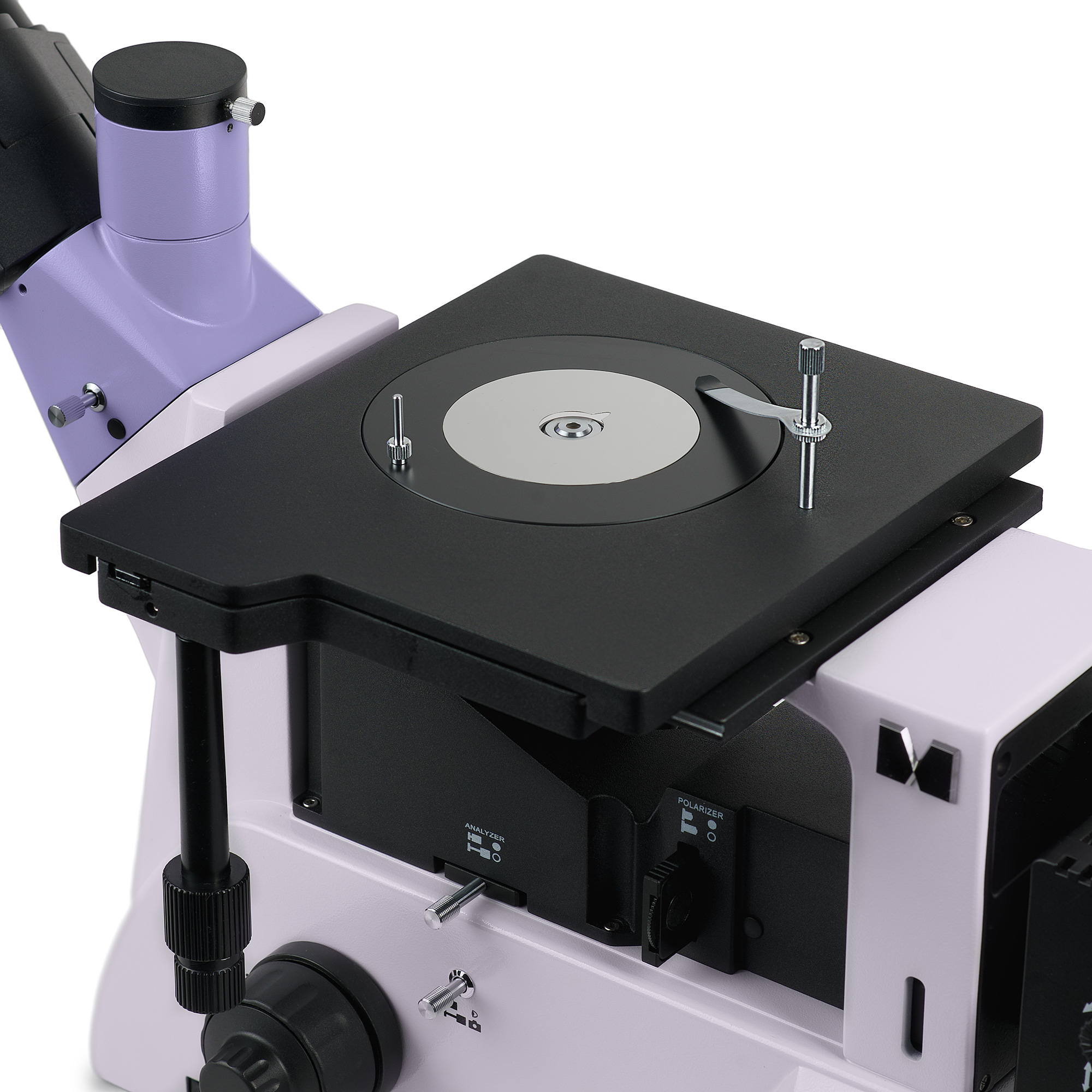 Съемные анализатор и поляризатор реализуют метод простой поляризации. Поляризатор вращается в диапазоне 0–360°, анализатор не вращается.Слайдер с призмой ДИК используется при работе по методу дифференциально-интерференционного контраста с объективами 5х, 10х и 20х.