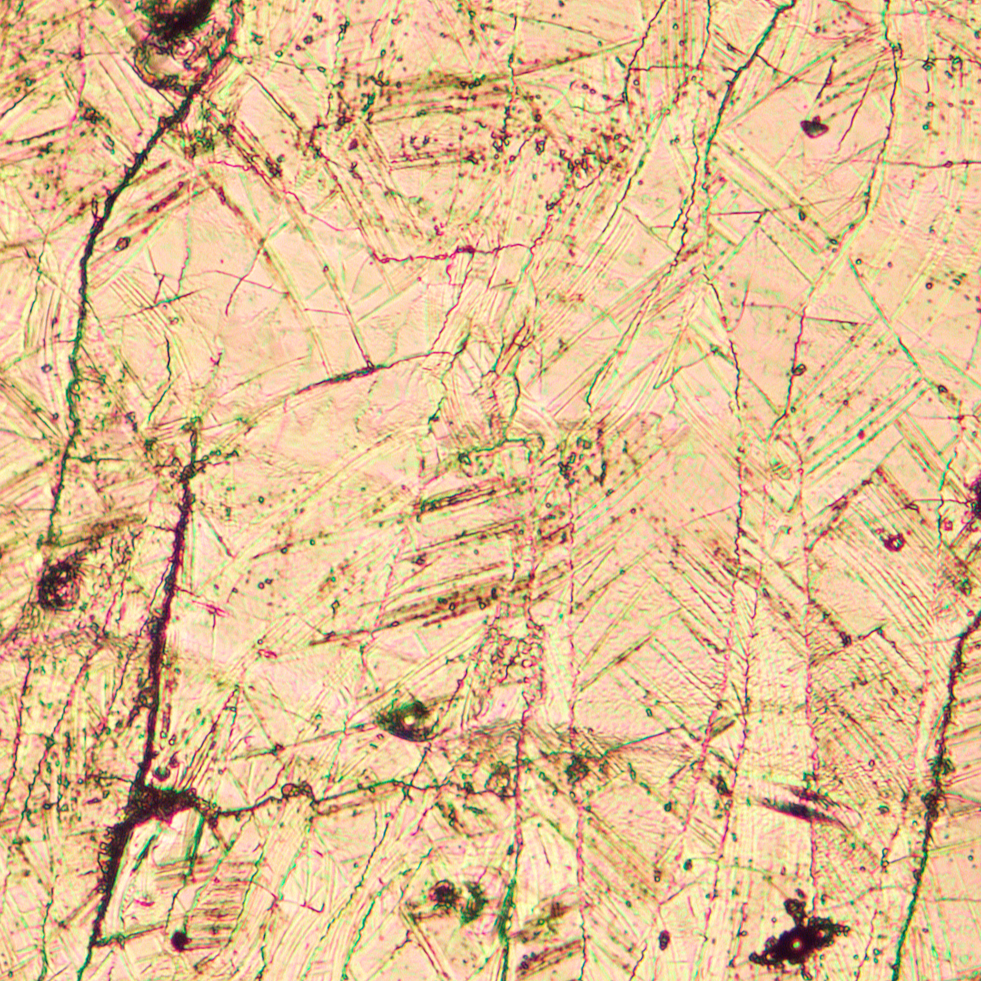 Светлое поле дает достоверное увеличенное изображение объекта. Простая поляризация убирает блики с металлических поверхностей, выделяет полимеры и другие инородные включения. Дифференциально-интерференционный контраст раскрашивает цветами изменения высоты объекта и таким образом показывает топографию образца. Объект исследования выглядит рельефным.