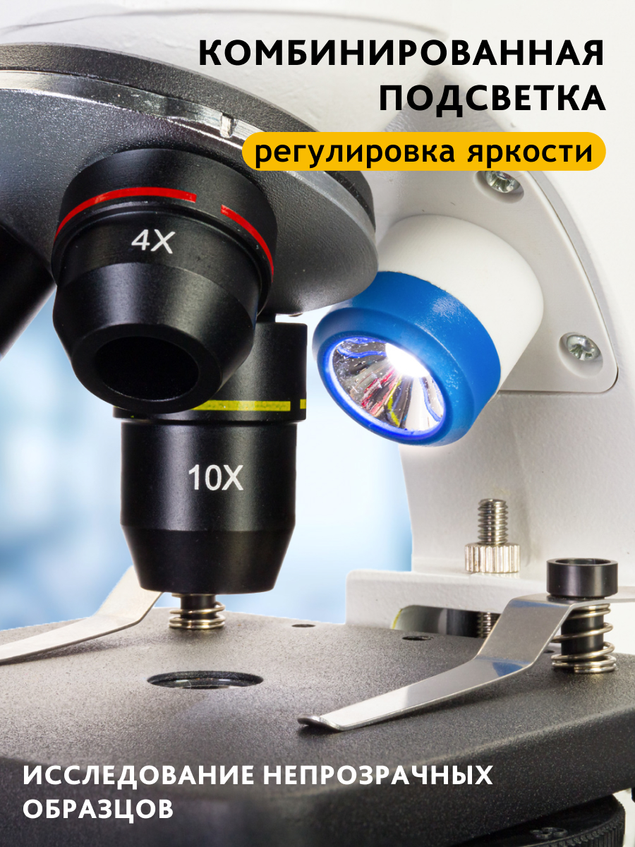 • Ахроматические объективы, широкопольный окуляр, увеличение 40–400 крат