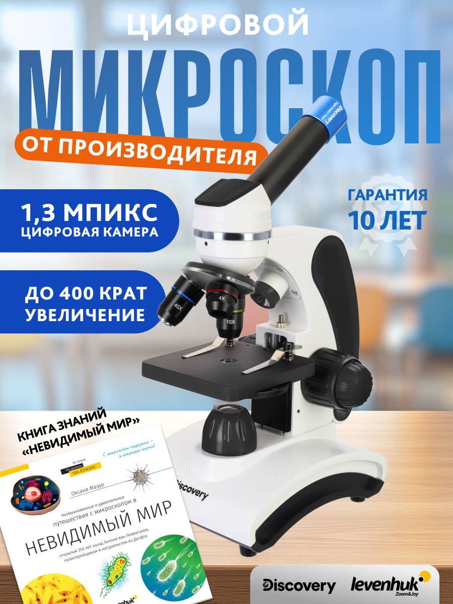 Цифровой микроскоп Levenhuk Discovery Pico Polar снабжен камерой 1,3 Мпикс, которая позволяет передавать изображение на внешний экран в режиме реального времени, а также фотографировать и записывать видео через микроскоп. Эта модель станет хорошим выбором для тех, кто раньше не работал с оптической техникой и хочет быстро и результативно погрузиться в исследование микромира. В качестве руководства к действию в комплектацию включена книга знаний «Невидимый мир».