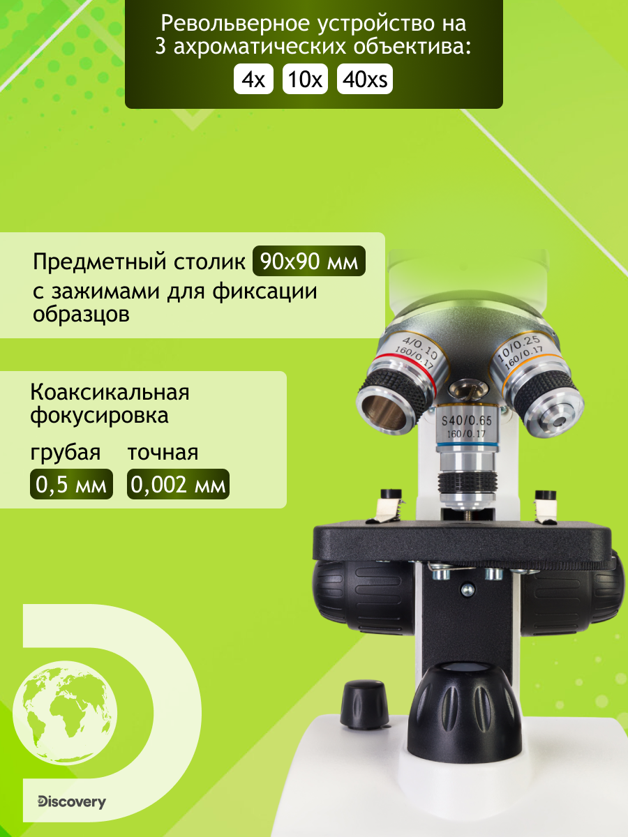 Levenhuk Discovery Femto Polar – монокулярный микроскоп для наблюдений в отраженном и проходящем свете с применением метода светлого поля. Он дает увеличение в диапазоне от 40 до 400 крат, что позволяет проводить множество исследований, причем как готовых микропрепаратов, так и самостоятельно изготовленных образцов. С его помощью можно увидеть простейших, крошечных водных обитателей, мелкие структуры растительных и животных тканей. Также в комплектацию включена познавательная книга о микромире.