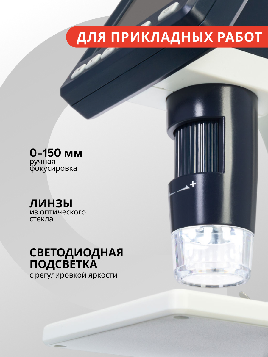 Levenhuk Discovery Artisan 128 – это цифровой USB-микроскоп для прикладных работ, который снабжен встроенным ЖК-экраном, а также может выводить картинку с объектива на телевизор или компьютер (поддерживаются операционные системы Windows и Mac OS). В микроскопе установлена камера 5 Мпикс (с интерполяцией до 12 Мпикс), увеличение можно выбирать в диапазоне от 20 до 500 крат, есть встроенная подсветка из 8 белых светодиодов регулируемой яркости. Микроскоп можно использовать для фотографирования и видеозаписи, а также линейных и угловых измерений, вычисления радиусов, площадей и проч.
