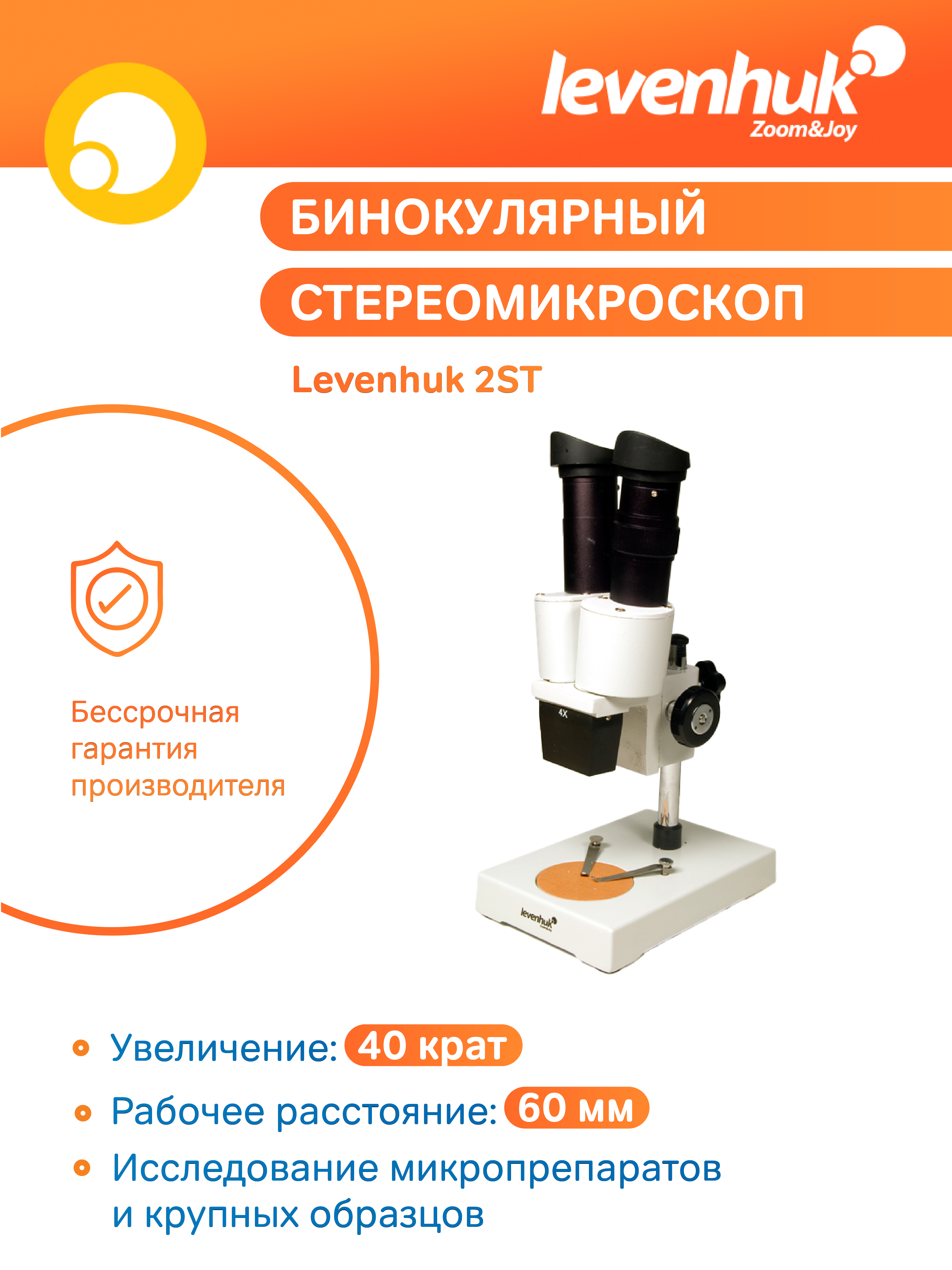 Микроскоп Levenhuk 2ST – современный инструментальный стереомикроскоп с увеличением 40 крат и рабочим расстоянием 60 мм. С помощью данной модели можно исследовать довольно крупные объекты: кусочки пород, монеты, ювелирные изделия, получая при этом четкое и объемное изображение. Такой портативный инструментальный микроскоп может стать незаменимым инструментом для проведения исследований в походных условиях. Археологи, геологи, биологи и коллекционеры по достоинству оценят и тот факт, что при проведении исследований используется естественное освещение. Предметный столик микроскопа двусторонний (с одной стороны черный, а с другой – белый). На корпусе микроскопа есть колесико грубой настройки фокусировки. В комплекте: