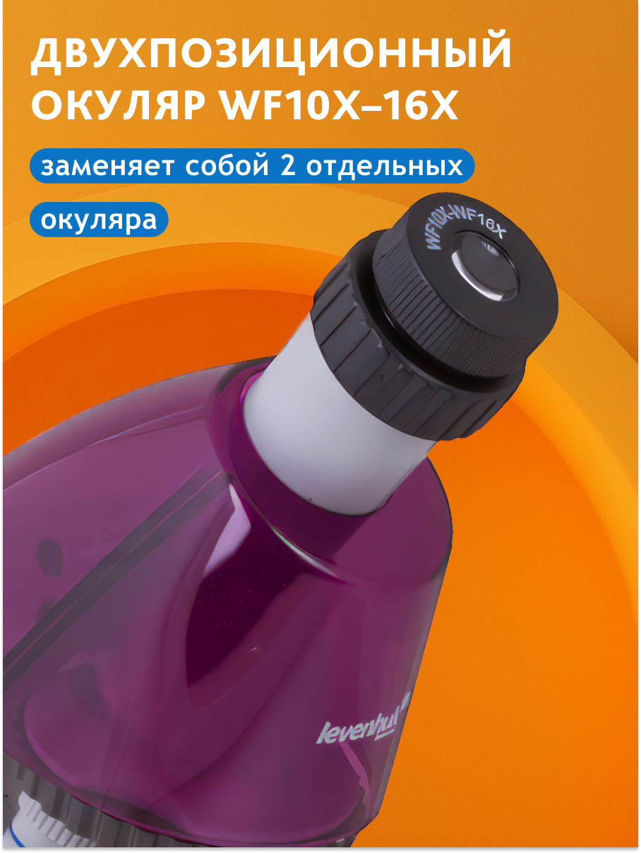Levenhuk LabZZ 101 – это детский микроскоп с полноценной «взрослой» оптической конструкцией. Три объектива установлены в специальном револьверном устройстве – оно позволяет быстро сменить объектив, не прерывая занятий. Уникальная особенность микроскопов этой серии – двухпозиционный выдвижной окуляр с двумя увеличениями – 10 и 16 крат. Такой окуляр очень прост в использовании. Микроскоп обеспечивает шесть степеней увеличения: 40, 64, 100, 160, 400 и 640 крат.