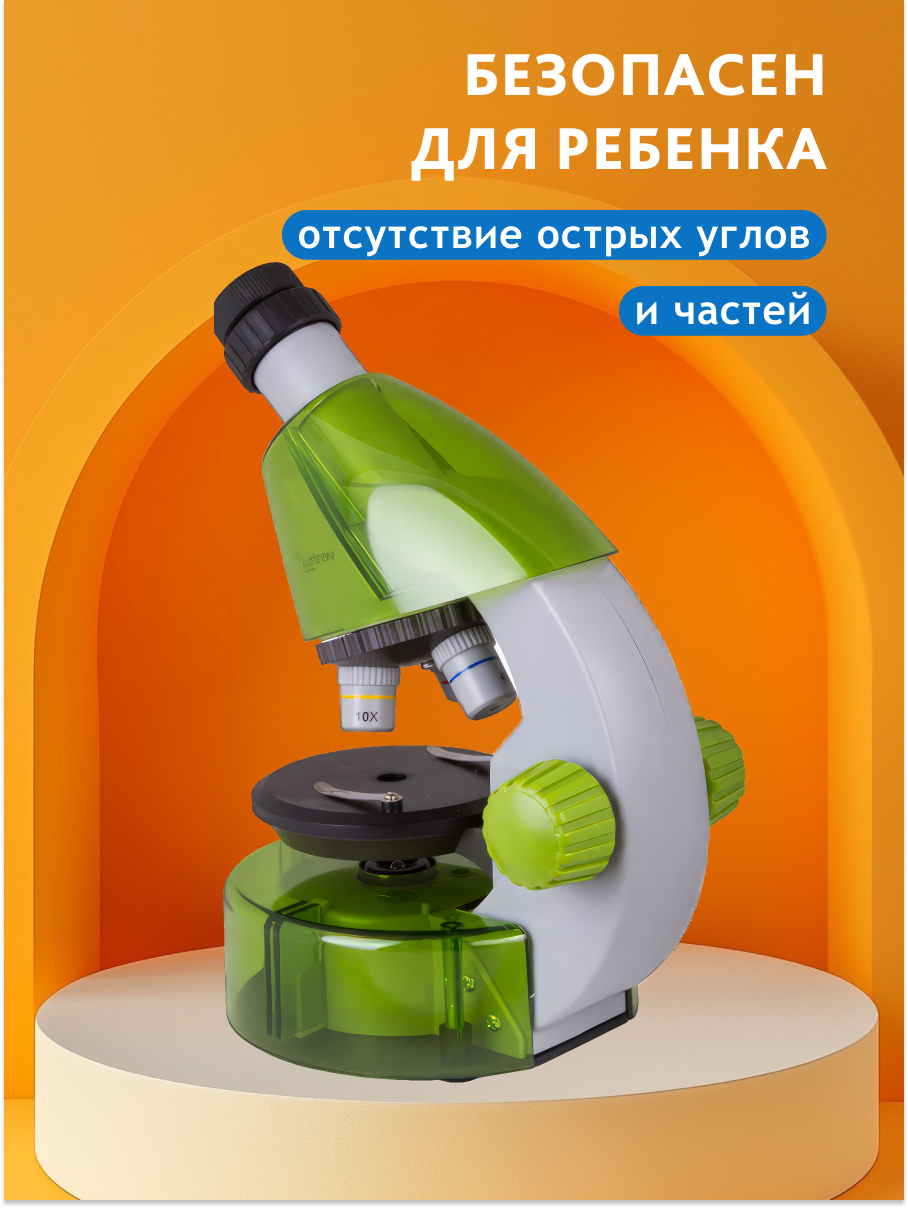 Корпус сделан из прочного пластика, поэтому он получился одновременно легким и надежным – идеальное сочетание для детского микроскопа. Чтобы ребенок не уставал во время опытов, окулярная насадка наклонена на 45°. Подсветка работает от батареек – микроскоп не нужно подключать к сети переменного тока. Это не только безопасно, но и удобно, ведь юный биолог сможет брать микроскоп на улицу.