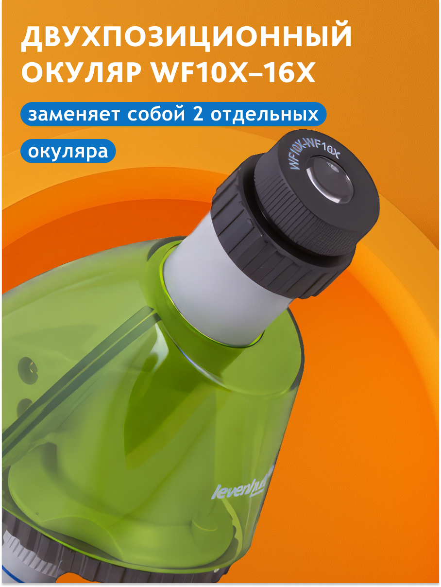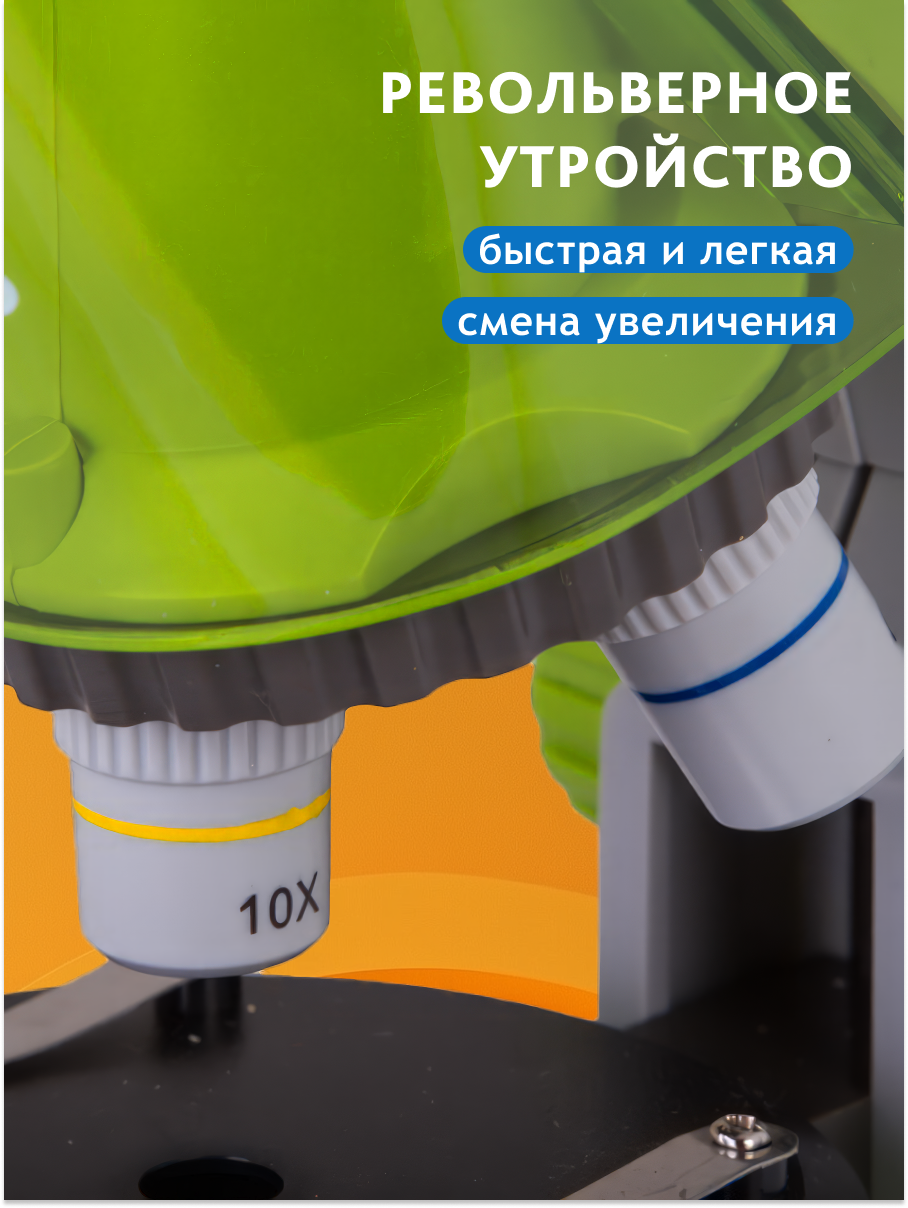Levenhuk LabZZ 101 – это детский микроскоп с полноценной «взрослой» оптической конструкцией. Три объектива установлены в специальном револьверном устройстве – оно позволяет быстро сменить объектив, не прерывая занятий. Уникальная особенность микроскопов этой серии – двухпозиционный выдвижной окуляр с двумя увеличениями – 10 и 16 крат. Такой окуляр очень прост в использовании. Микроскоп обеспечивает шесть степеней увеличения: 40, 64, 100, 160, 400 и 640 крат.