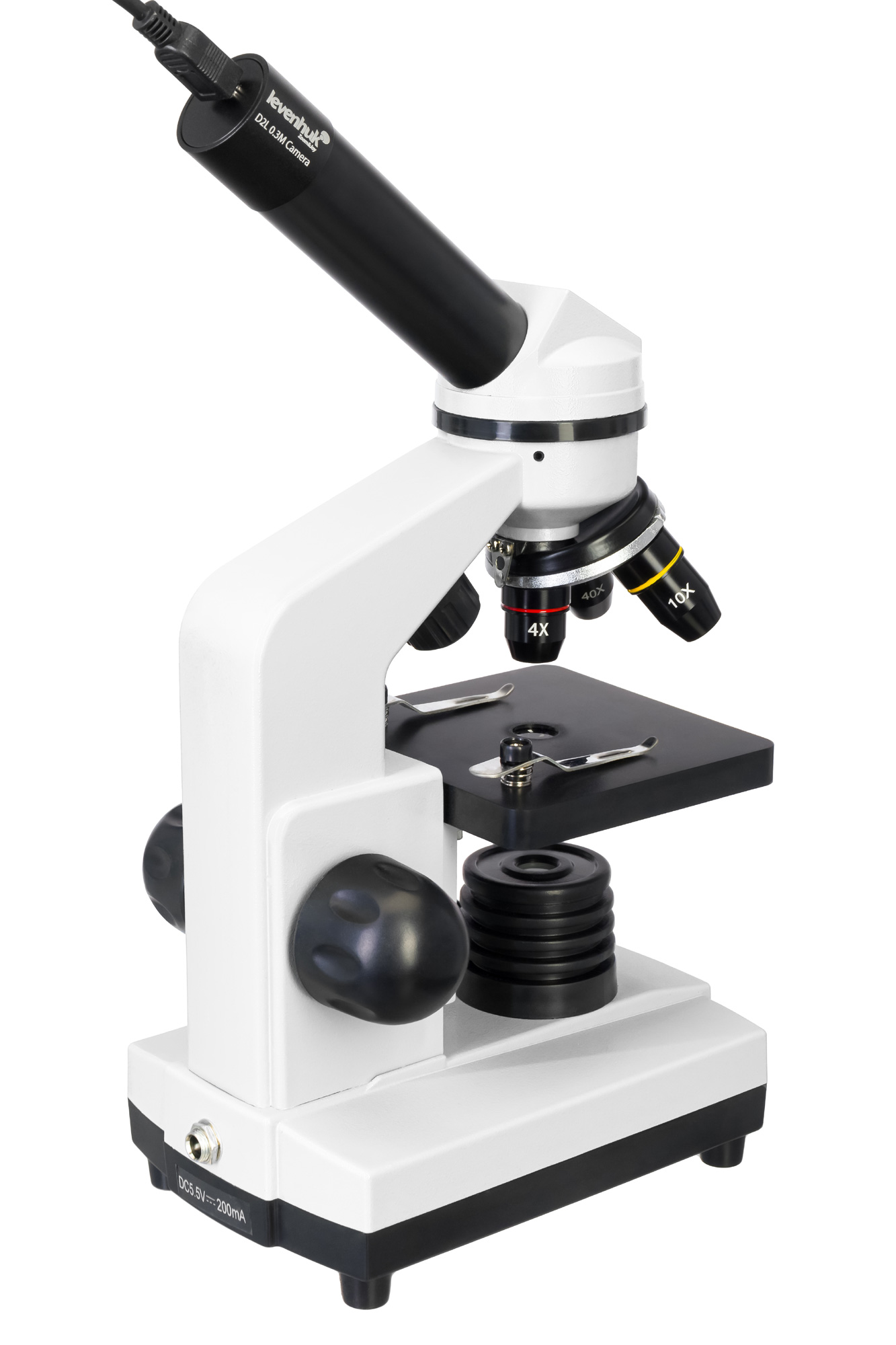 Корпус прибора изготовлен из прочного пластика, поэтому микроскоп отличается небольшим весом и в то же время надежностью. Для комфортной работы окулярная насадка наклонена на 45°. Камера работает от компьютера через USB-кабель. Для питания микроскопа прибор нужно подключить к сети переменного тока. Кроме того, можно использовать стандартные батарейки.