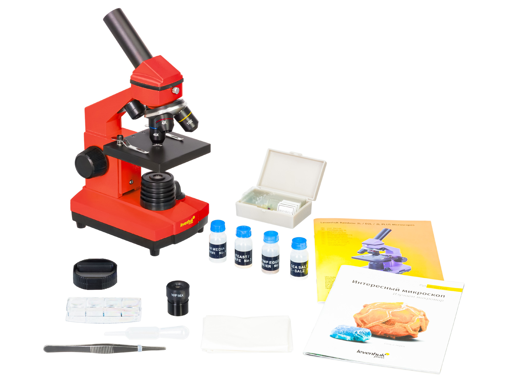 В комплект входит набор Levenhuk K50, в котором есть готовые препараты, инструменты для работы с микроскопическими объектами и подробное руководство с полезными советами и описаниями интересных опытов.