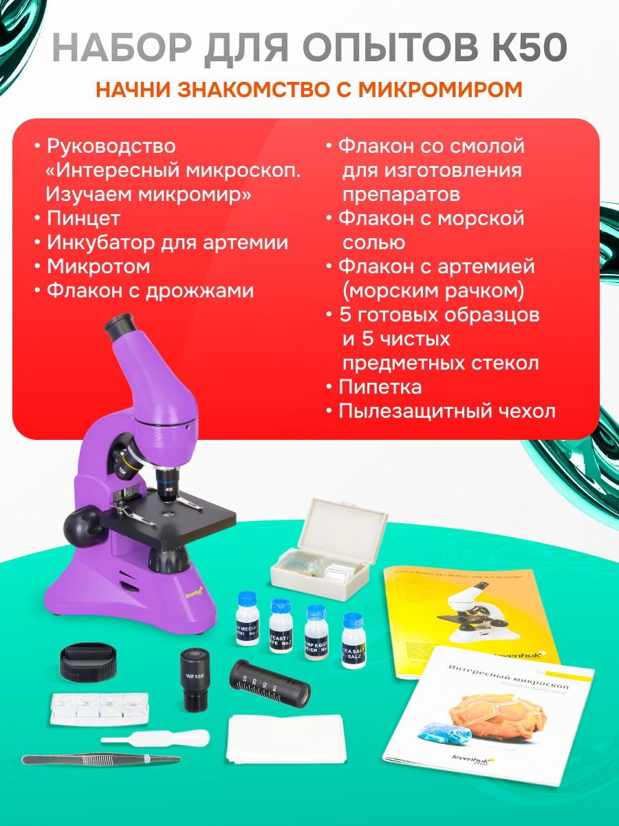 В комплект входит набор LevenhukK50, в котором есть все, что необходимо начинающему биологу: готовые препараты, инструменты для работы с микроскопическими образцами и подробное руководство с полезными советами и описаниями опытов.