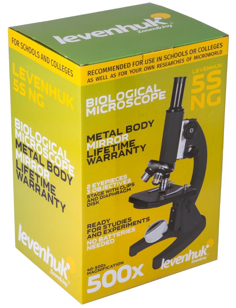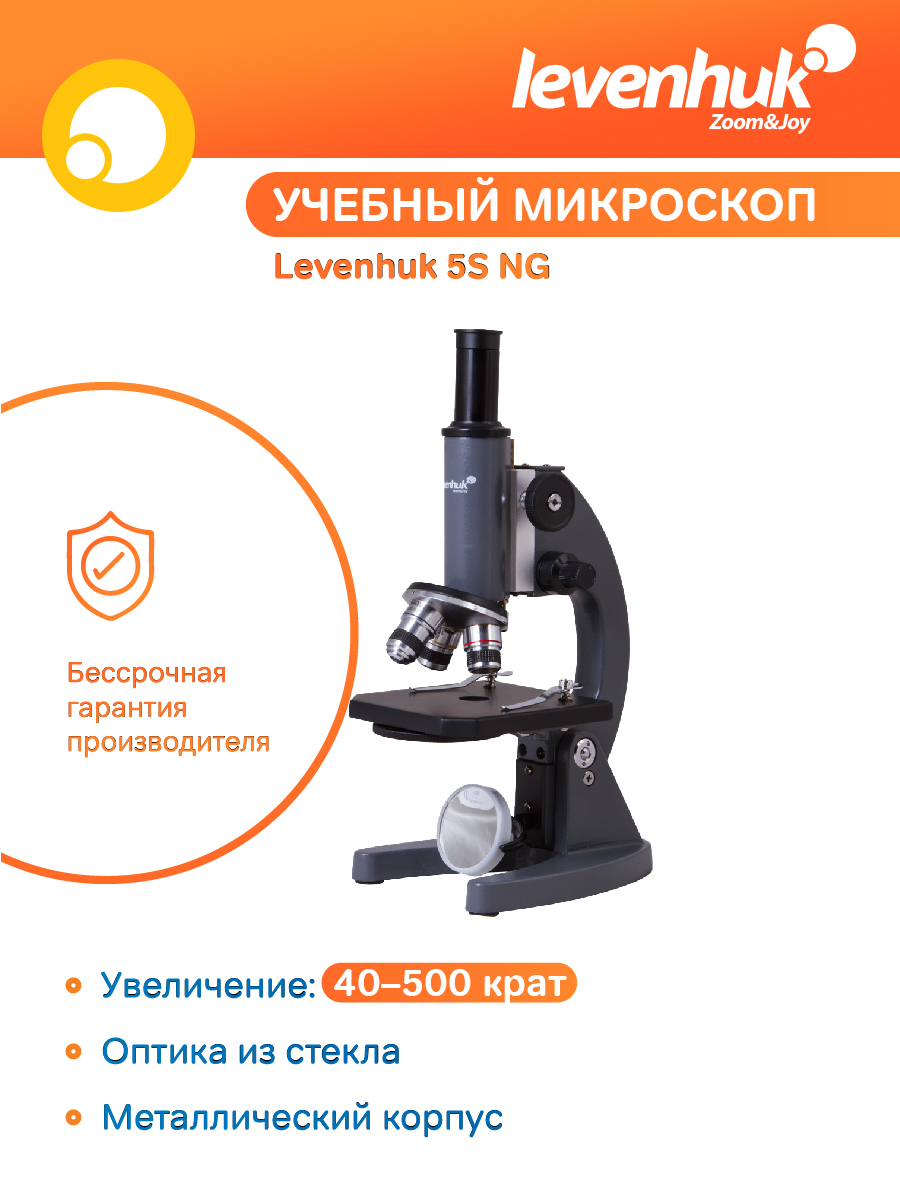 Микроскоп Levenhuk 5S NG – прекрасный выбор для учебы и хобби. Благодаря простому управлению и надежной конструкции этот микроскоп станет хорошим помощником ребенку на многие годы. С помощью Levenhuk 5S NG можно проводить простые биологические опыты, изучать жизнь амеб и инфузорий, рассматривать готовые микропрепараты. Увеличение микроскопа достигает 500 крат, которого вполне хватает для большинства микробиологических исследований начального уровня.