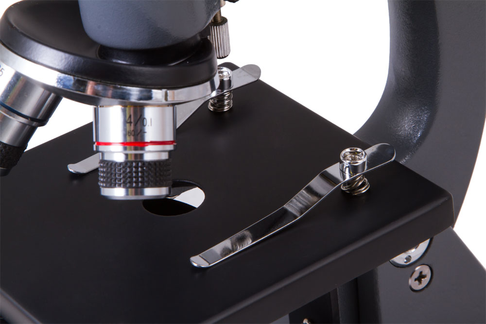 В микроскопе используются стеклянные оптические элементы, которые передают четкую и детализированную картинку. Револьверное устройство рассчитано на три объектива, а в окулярную трубку можно устанавливать окуляры разной кратности. Увеличением микроскопа легко управлять прямо во время наблюдений. Механизмы грубой и точной фокусировки позволяют регулировать резкость максимально плавно. Образцы на предметном столике фиксируются при помощи металлических препаратодержателей.