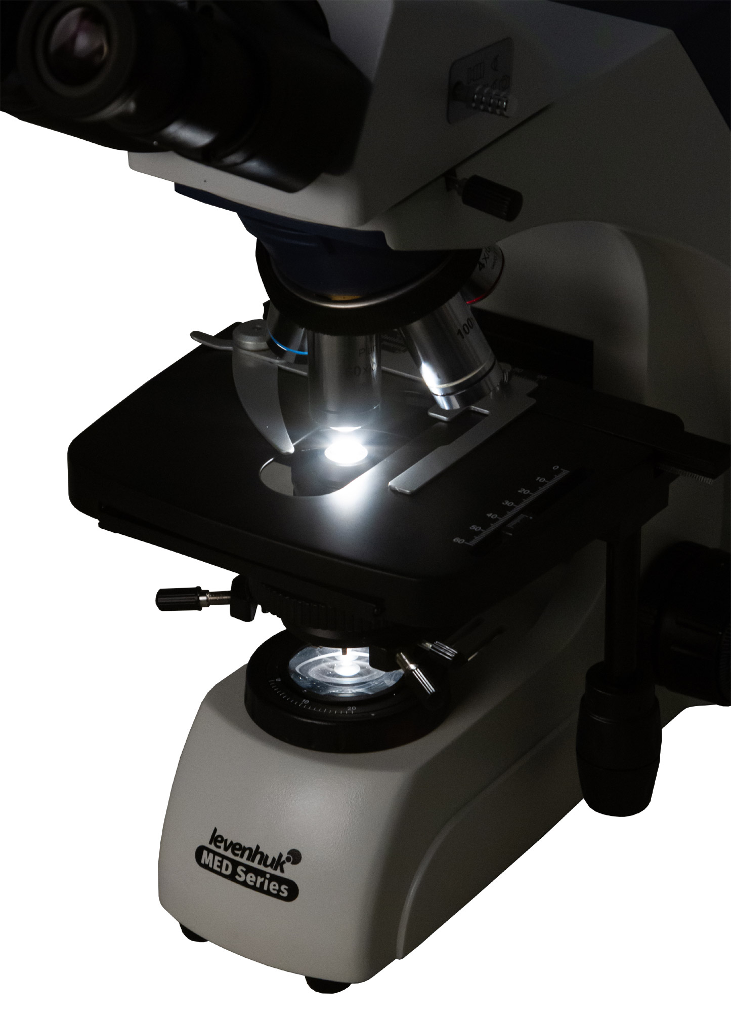 Система освещения расположена в нижней части микроскопа. Она состоит из галогенной подсветки с регулировкой яркости и конденсора Аббе с ирисовой диафрагмой. Можно настраивать освещение по методу Келера. Образцы устанавливаются на двухкоординатный предметный столик с препаратоводителем. Резкость настраивается при помощи ручек грубой и точной фокусировки.