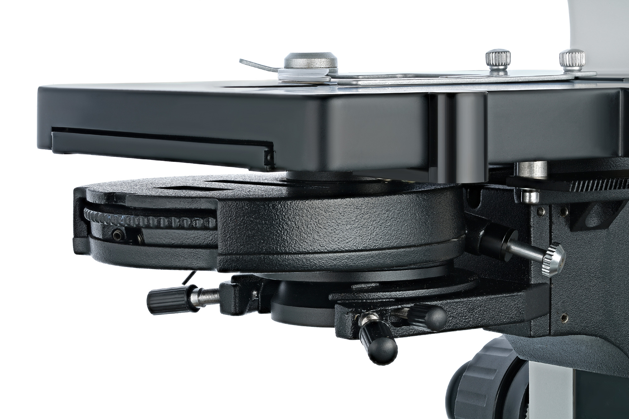 Предметный столик снабжен препаратоводителем, который делает работу с образцами более удобной. Рядом находятся ручки грубой и точной фокусировки. Под столиком расположены фазовый конденсор, держатель фильтра и яркая светодиодная подсветка, работающая от сети переменного тока. Яркость подсветки можно регулировать.
