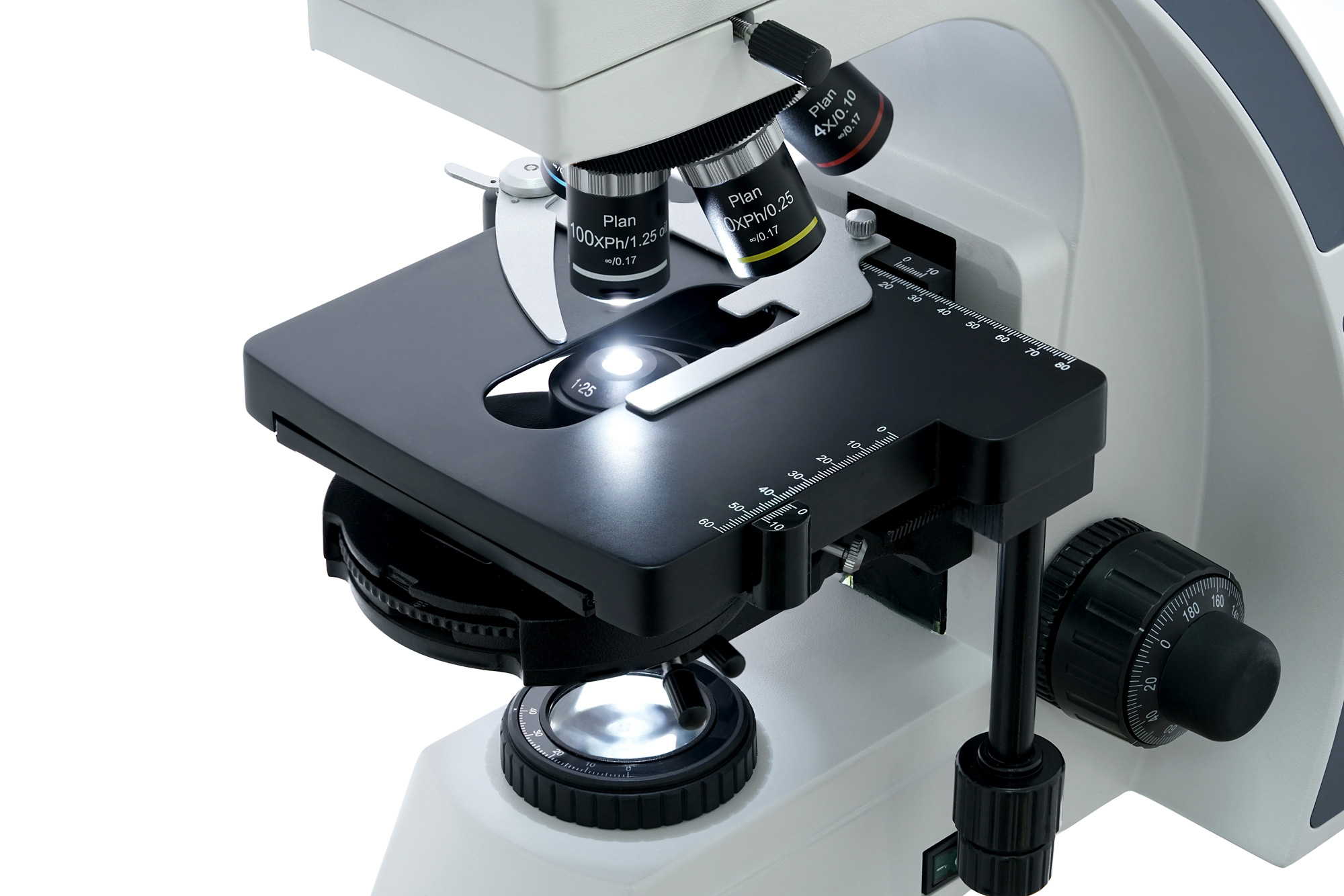 Предметный столик можно перемещать по двум направлениям. Препаратоводитель помогает точно установить образцы под объективом микроскопа. Яркий 5-ваттный светодиод освещает микропрепараты снизу, при этом свет проходит через фазовый конденсор («сухой»). Есть держатель фильтра. Яркость подсветки регулируется.