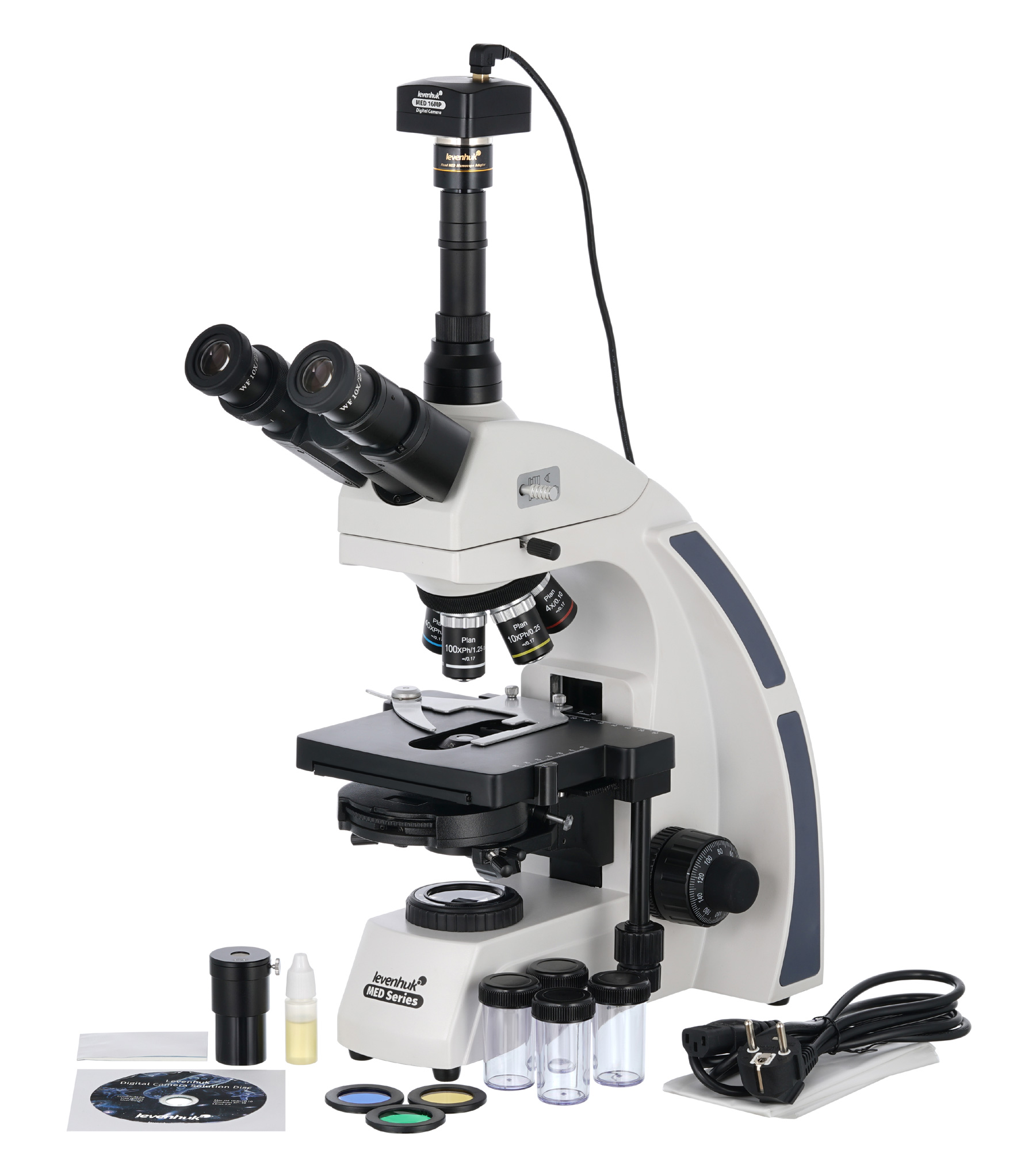 16-мегапиксельная камера устанавливается в вертикальную окулярную трубку и подключается к компьютеру при помощи USB-кабеля. Она передает картинку с объектива микроскопа в режиме реального времени, позволяет записывать видеоролики и снимать фотографии. Высокое качество записей и снимков позволяет использовать их в профессиональной деятельности. Кроме того, в комплекте есть диск с программой для обработки изображений.