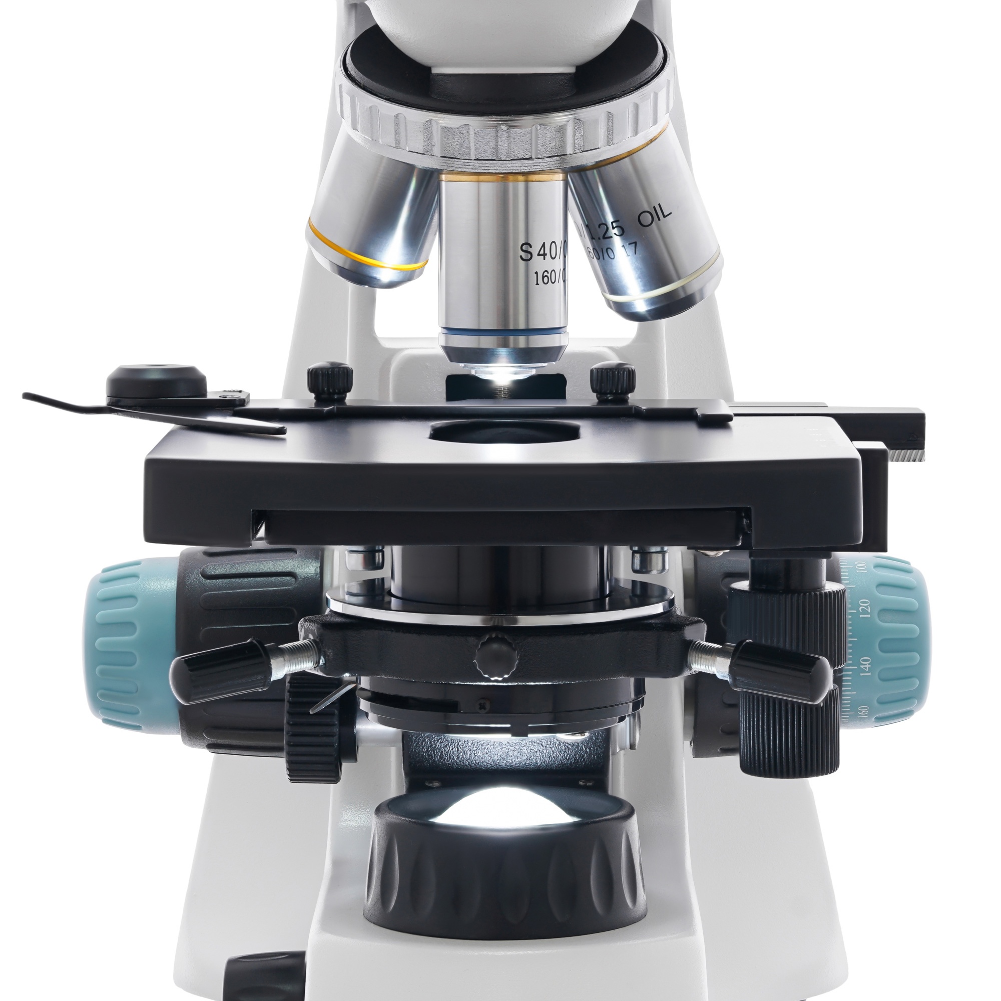 Поворотную насадку можно вращать на 360°, бинокулярный визуальный узел имеет удобный для длительной работы наклон в 30°. Окуляры широкопольные и дают увеличение в 10 крат, револьверное устройство вмещает четыре объектива – в него уже установлены ахроматические объективы с увеличением 4х, 10х, 40х и 100х. 100-кратный объектив можно использовать для масляной иммерсии. Обратите внимание, что объективы 40х и 100х имеют специальные пружинящие оправы, защищающие переднюю линзу от случайных повреждений.